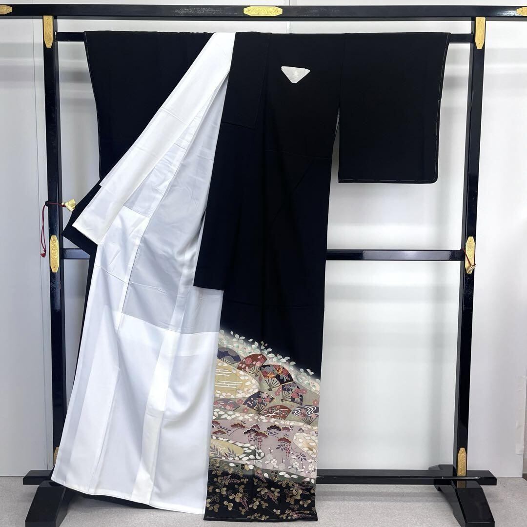 黒留袖 流水に花模様 扇子 金駒刺繍 しつけ糸 トールサイズ K-3973 着物 きもの kimono 和服 和装 中古 リサイクル着物 【送料無料】