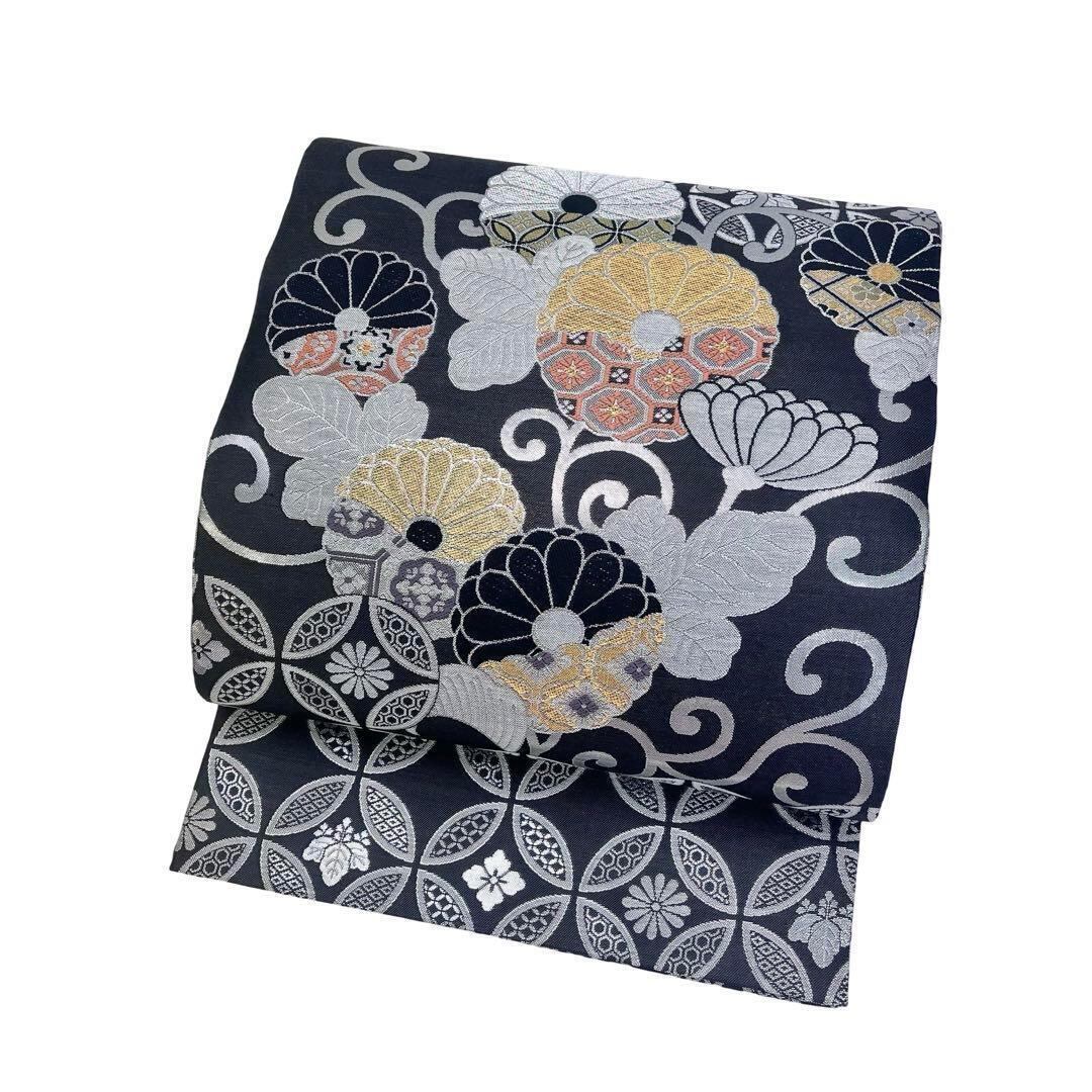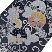 薄墨色ベースのモノトーン調の色彩に花七宝、花唐草、菊の花などの柄裄がデザインされたモダンな雰囲気の素敵なお品でございます。