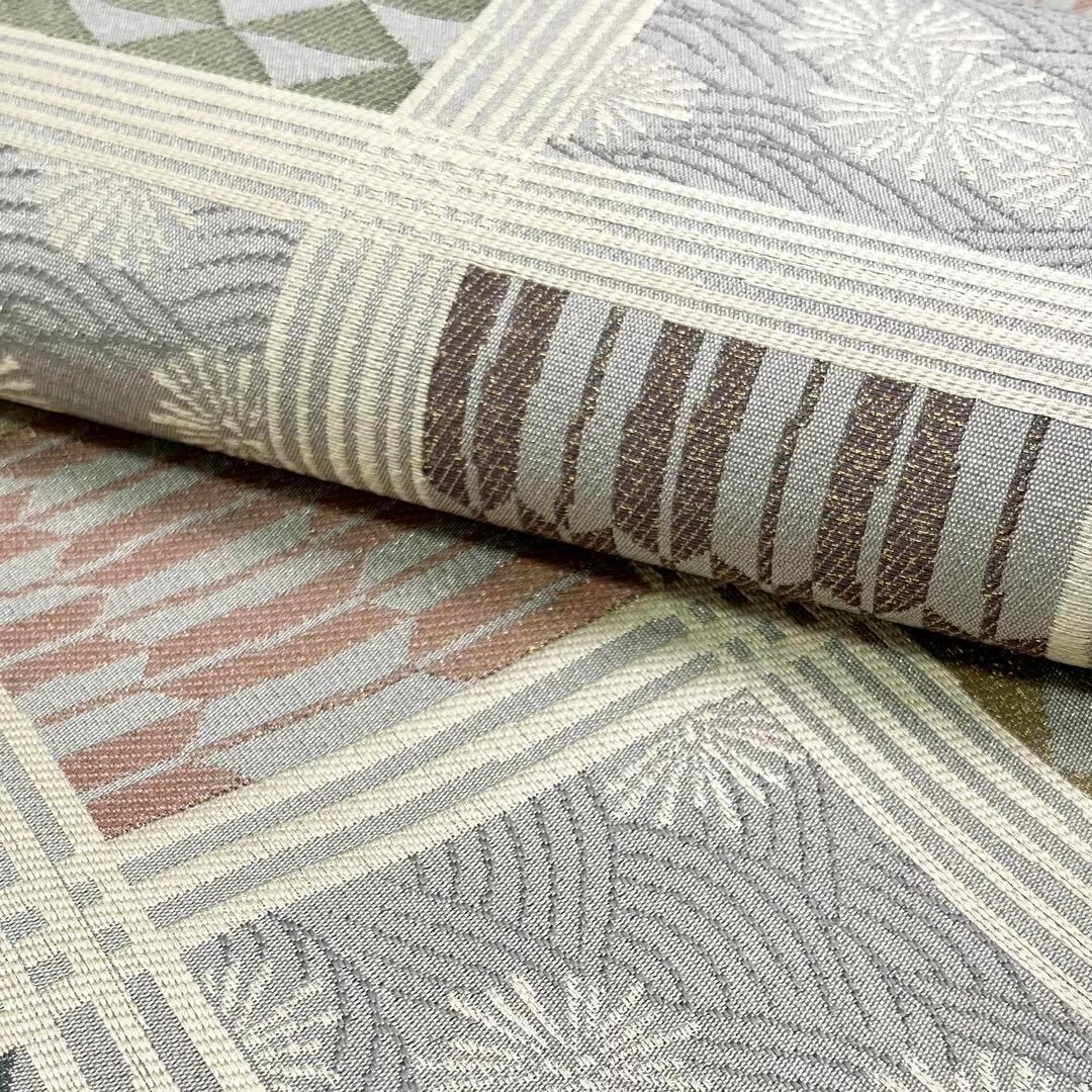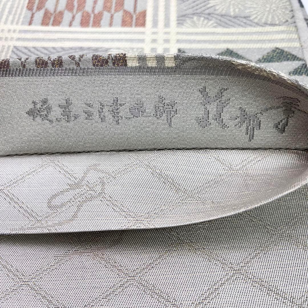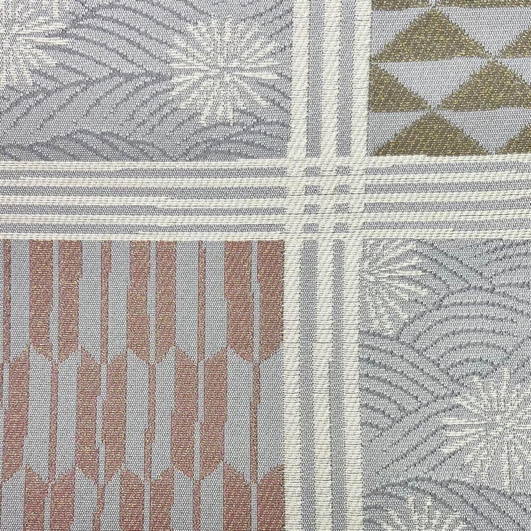 白梅鼠ベースの品のあるお色味、格子柄に鱗柄、矢羽、花模様など多様な紋様がデザインされた素敵な柄裄のお品でございます。