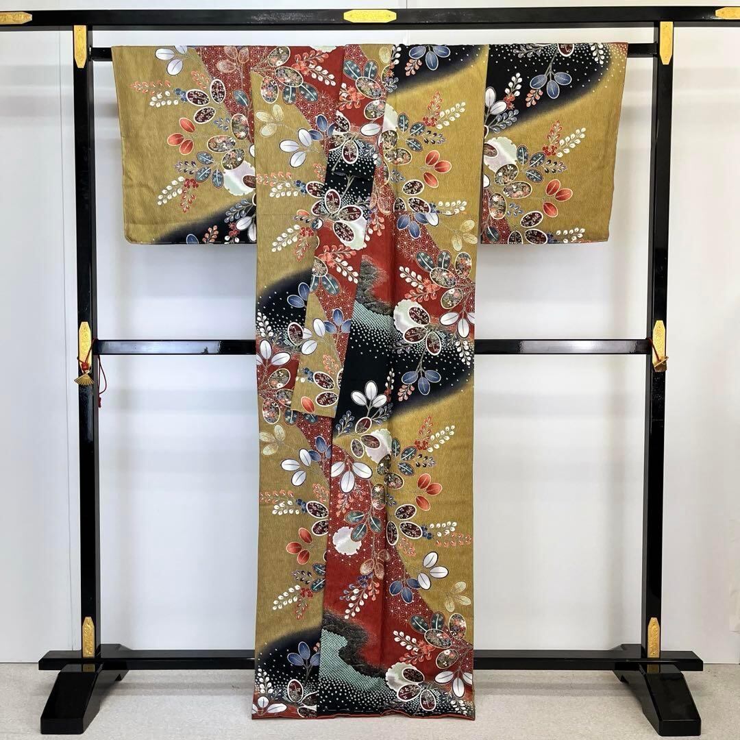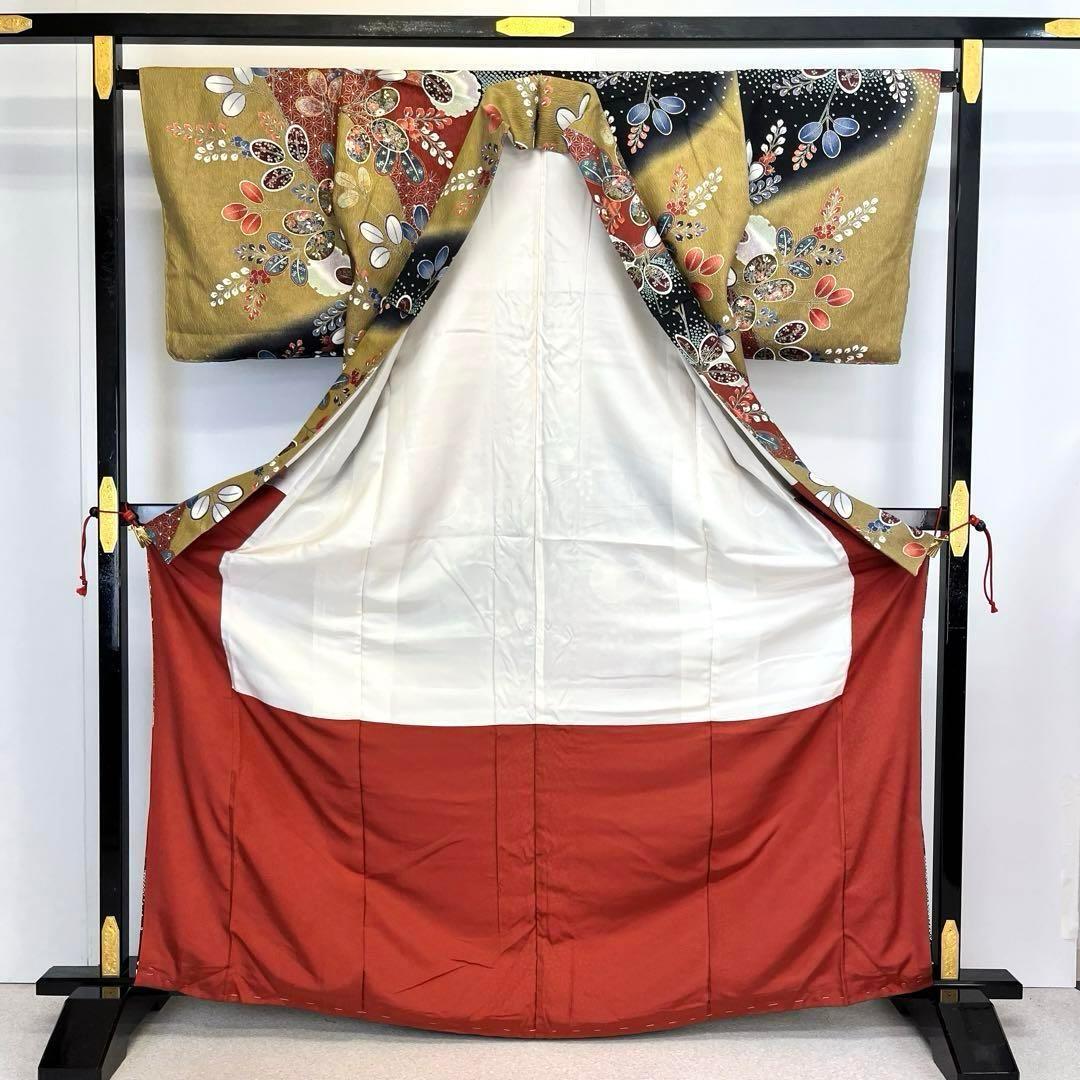楊梅色ベースのお色味に金銀彩が使われた流水に萩の花模様がデザインされた素敵な柄裄のお品でございます。