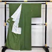 青丹色の濃い目の緑色の美しい色彩の素敵な色無地のお着物です。
