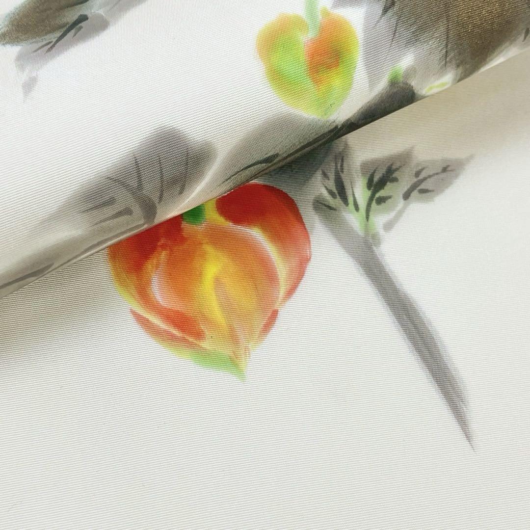 乳白色の塩瀬に鬼灯の柄裄がデザインされた素敵な柄裄のお品でございます。