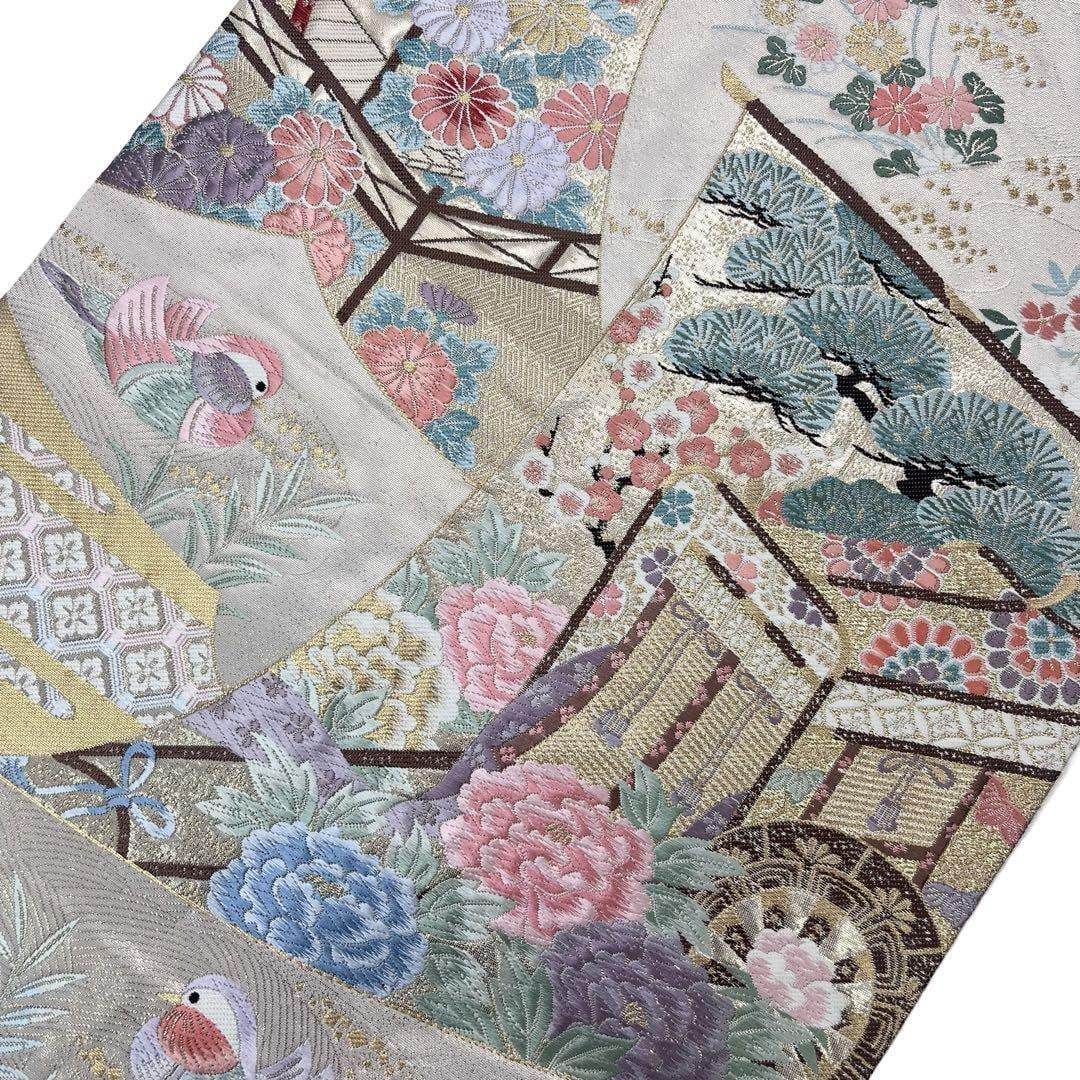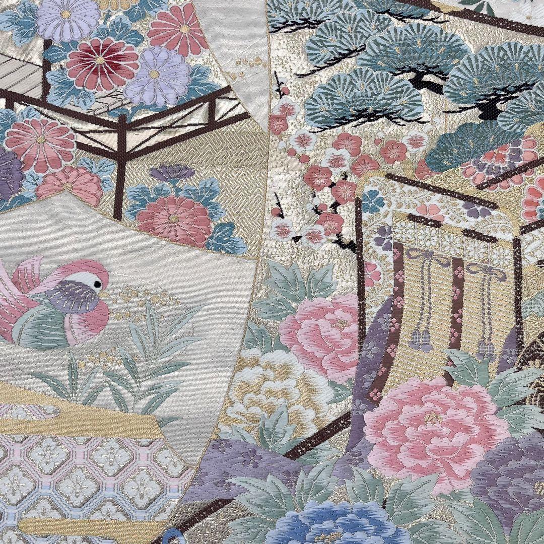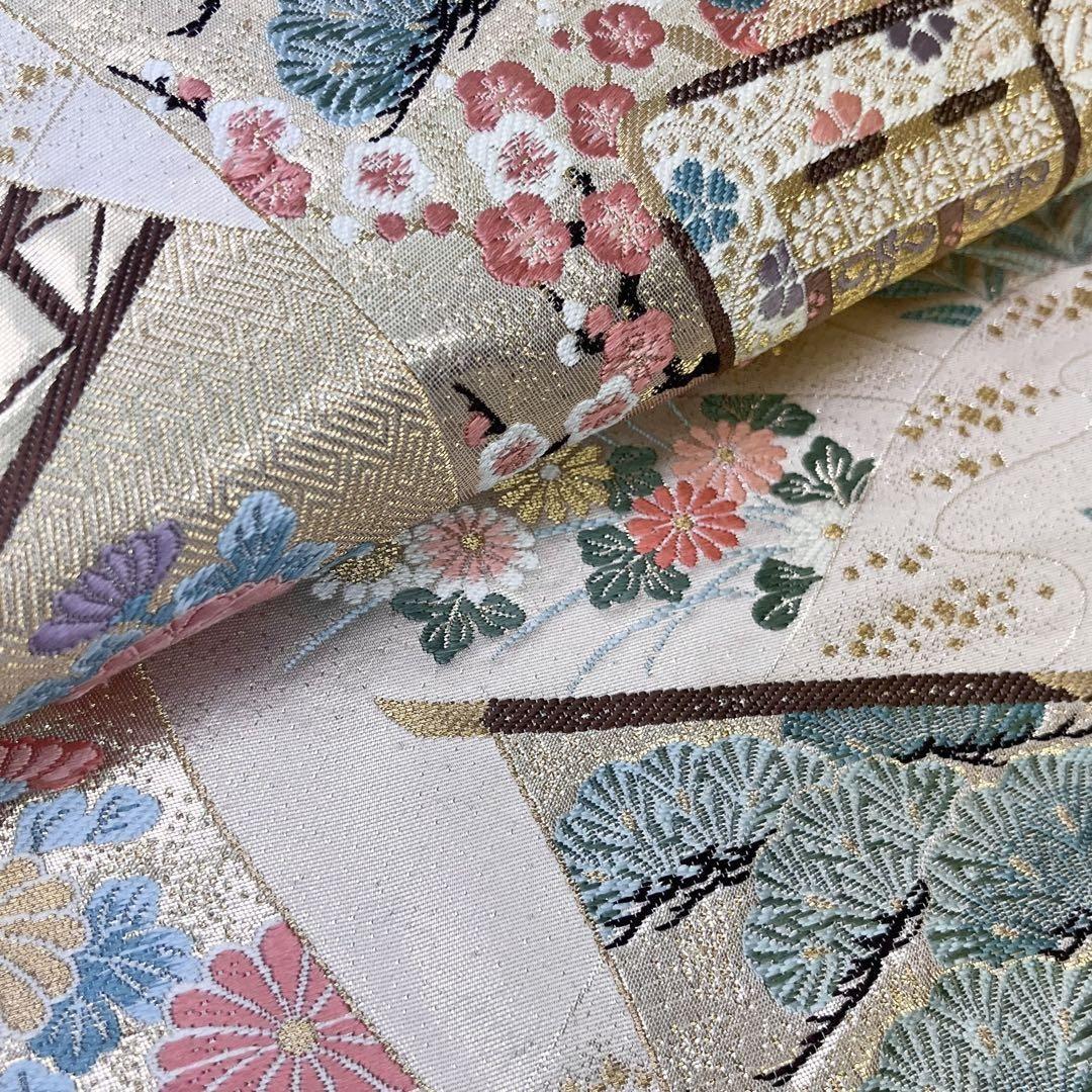 九百錦、花鳥華飛鶴、本金二重箔、美しい花柄に鶴などの柄裄がデザインされた素敵な柄裄のお品でございます。