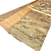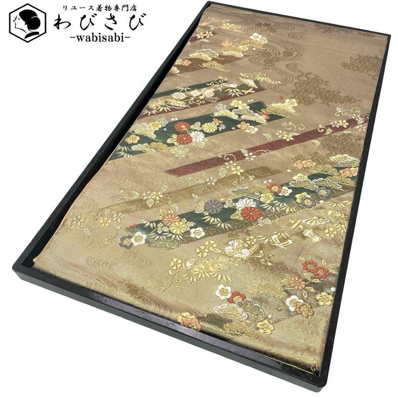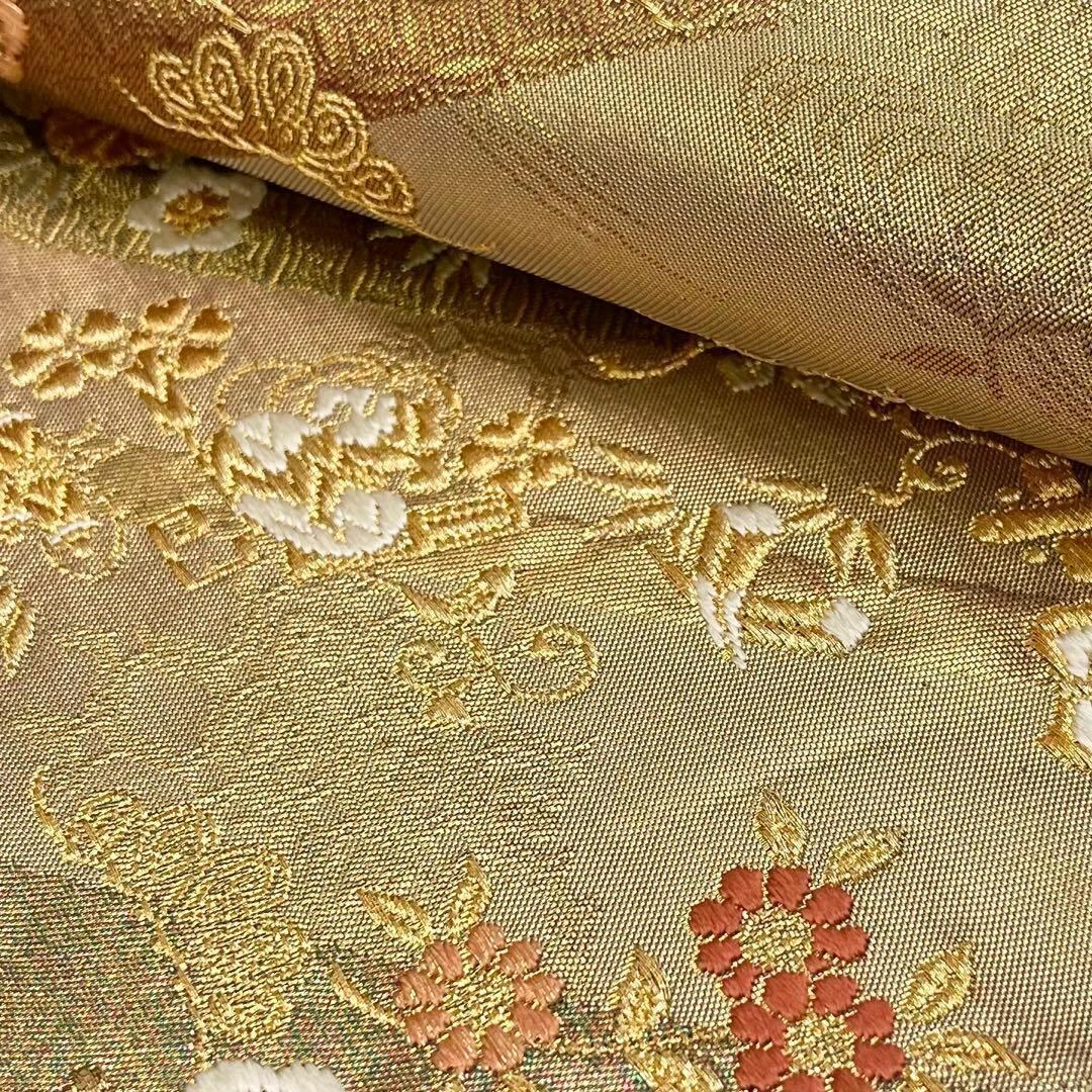 金色ベースのお色味に花模様、宝尽くし、松竹梅などの柄裄がデザインされた素敵なお品でございます。
