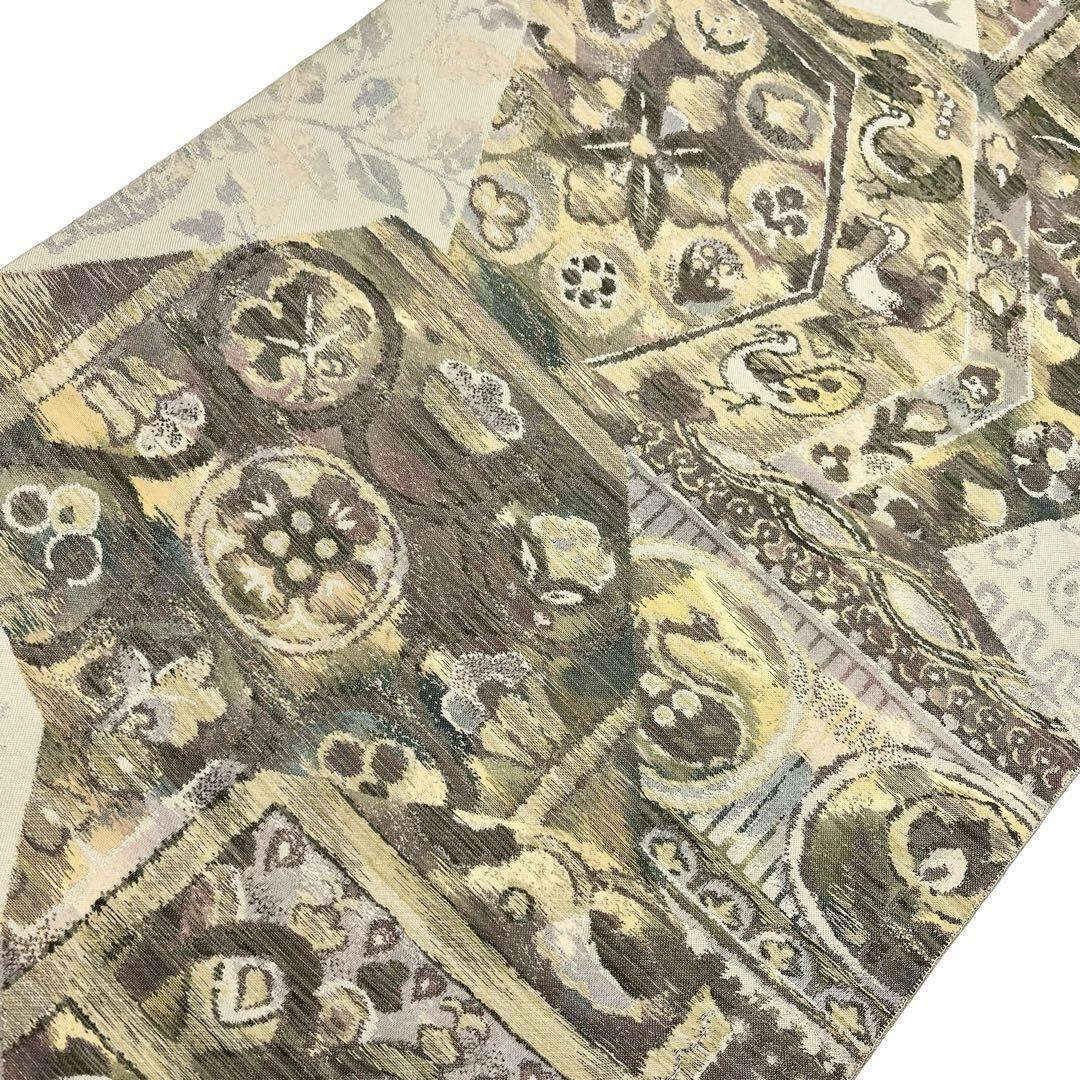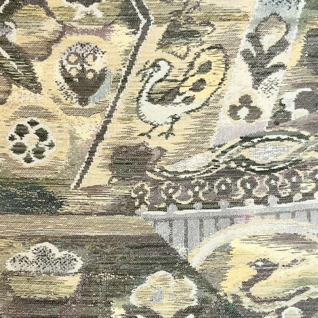 袋帯 抽象花鳥模様 紬 牙黄色 O-4077 着物 きもの kimono 和服 和装 中古 リサイクル着物 【送料無料】