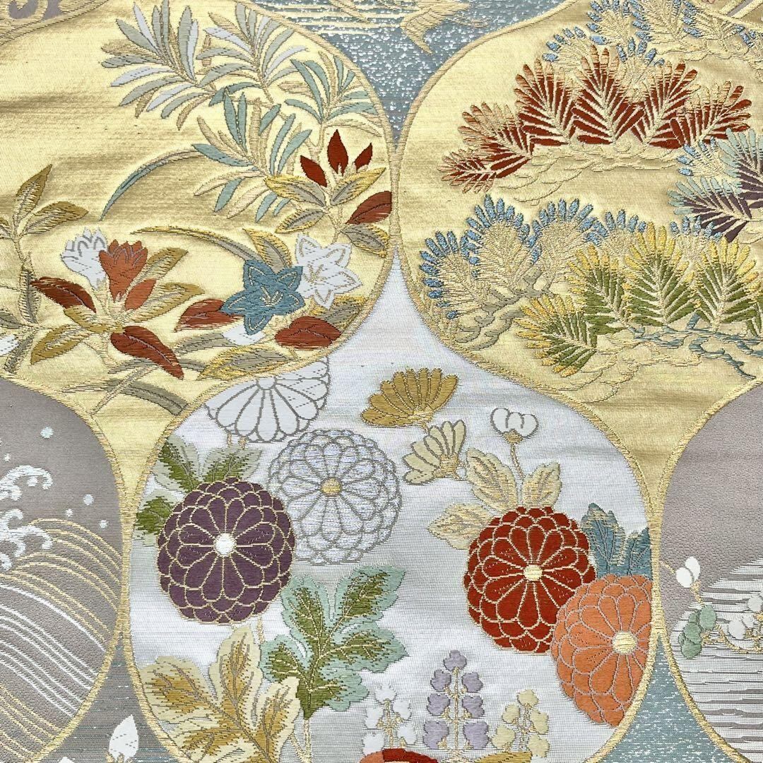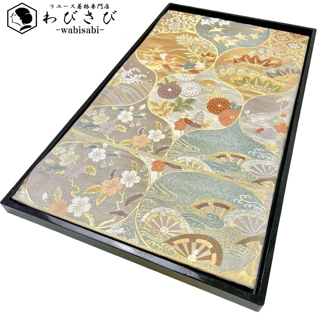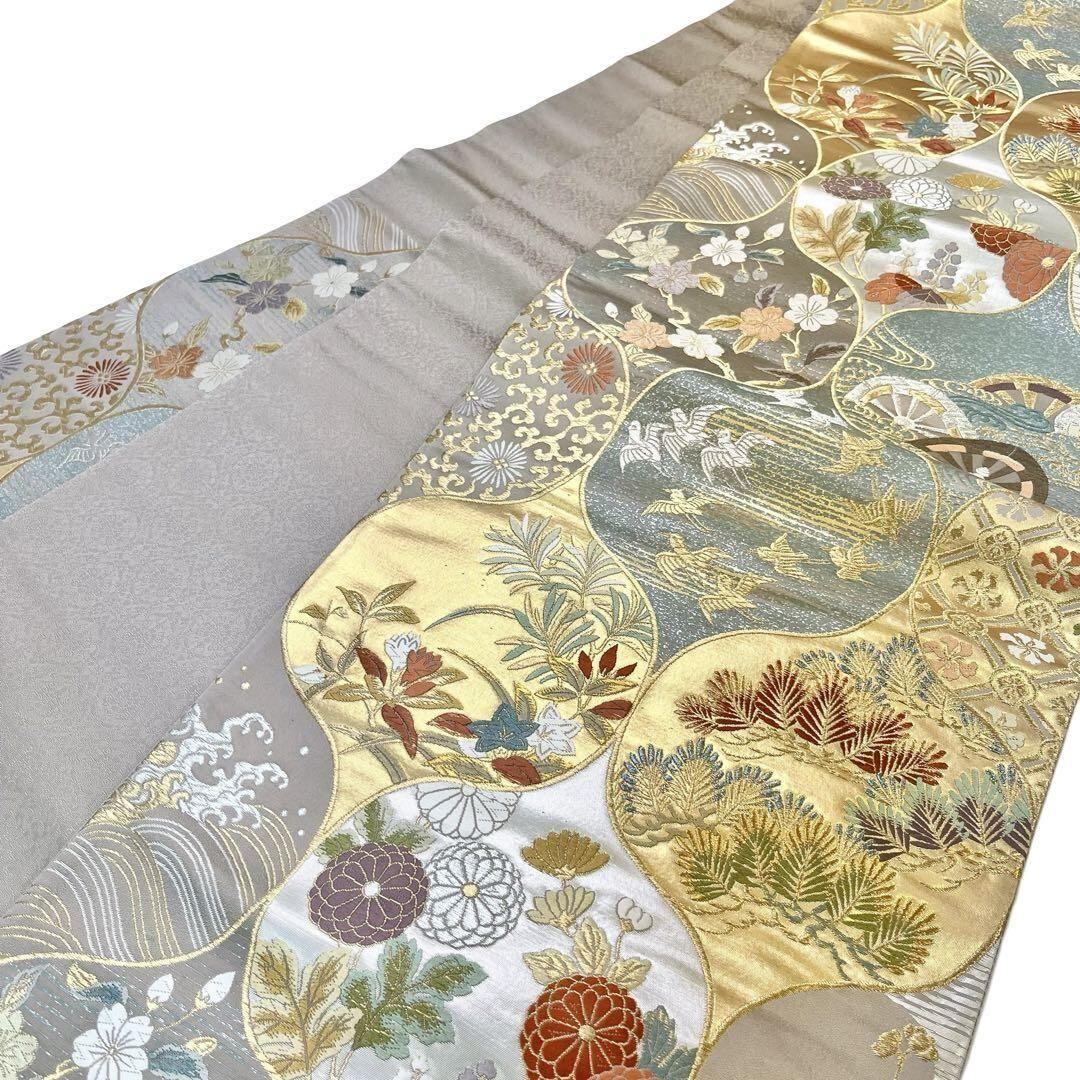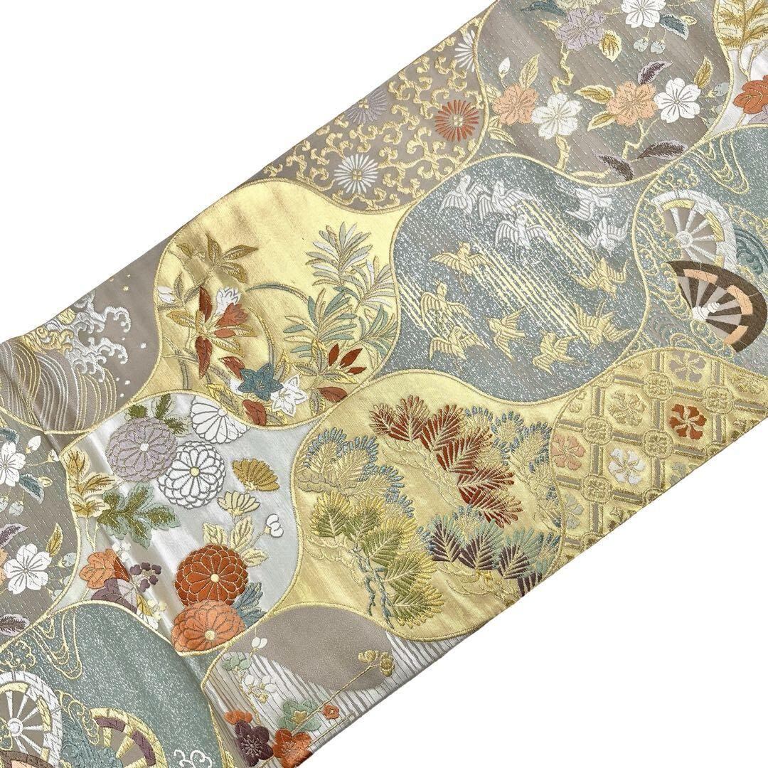 袋帯 花草模様に鳥 菊 松葉 唐草 金銀糸 遠州鼠色 O-4066 着物 きもの kimono 和服 和装 中古 リサイクル着物 【送料無料】