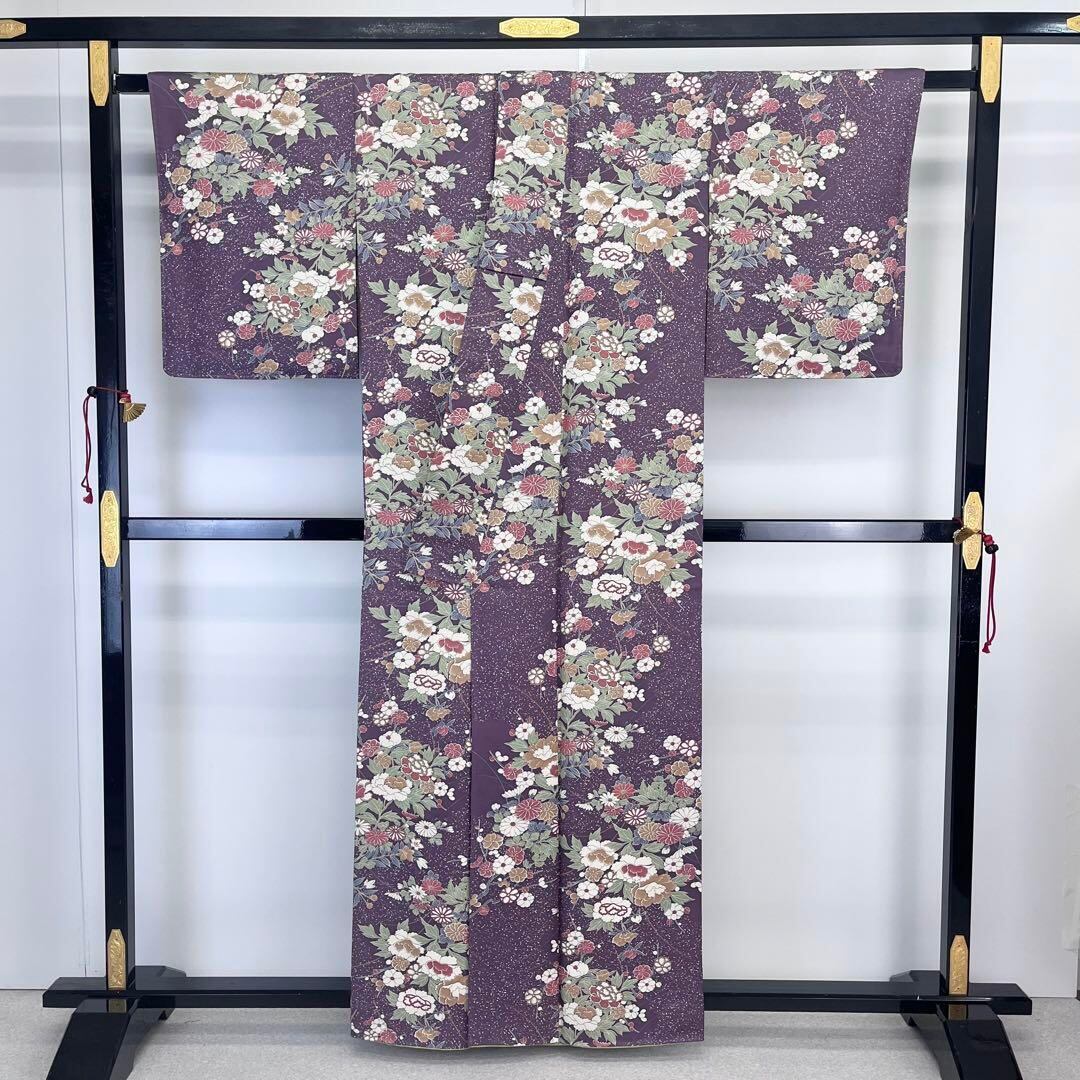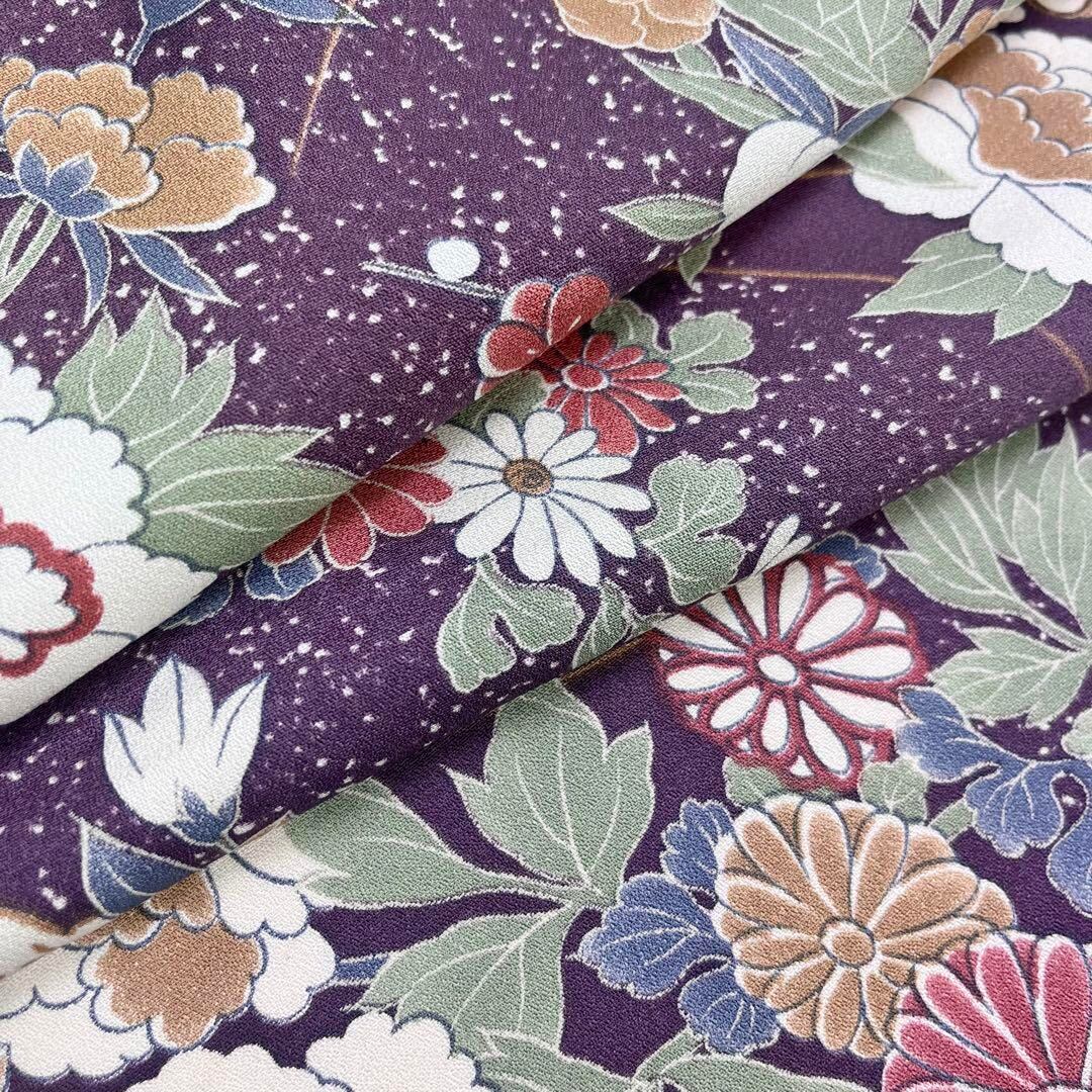 小紋 華やかな花模様 叩き染 葡萄紫色 縮緬 K-3985