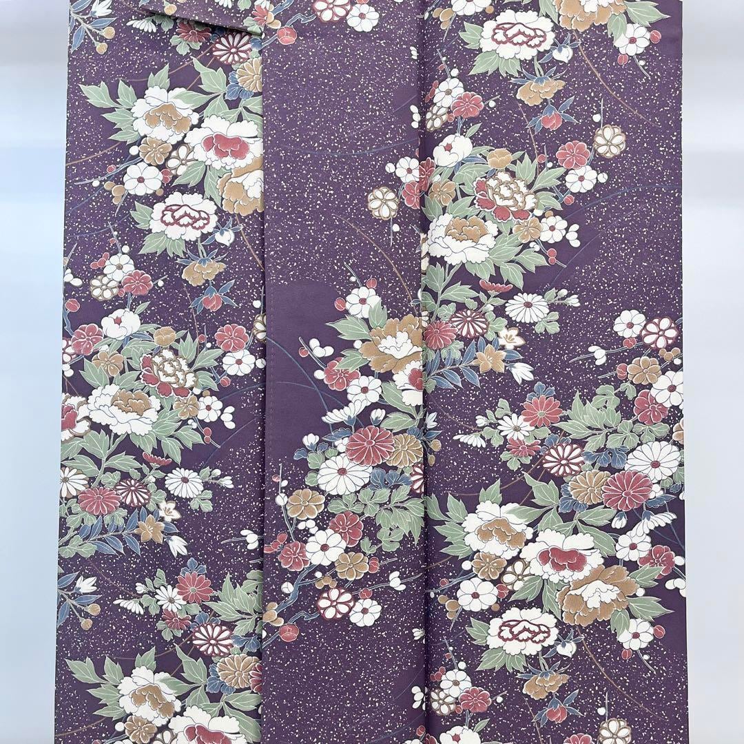 葡萄紫色の縮緬に叩き染、華やかな花模様がデザインされた素敵な柄裄のお品でございます。