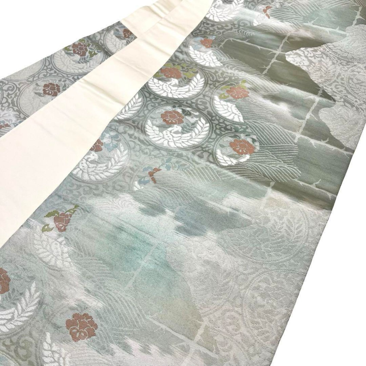 袋帯 丸に鳥と花模様 銀糸 豆青色 O-4073