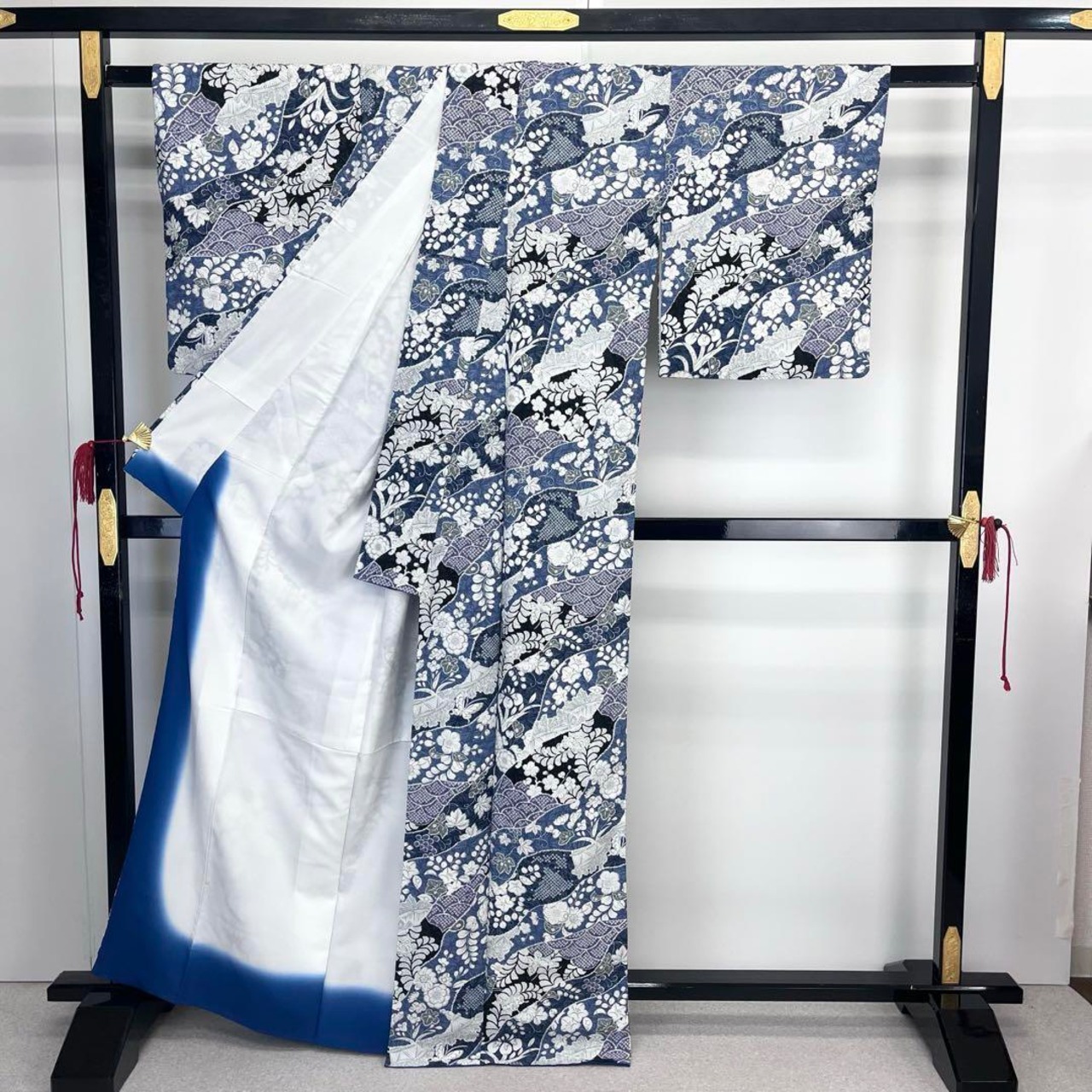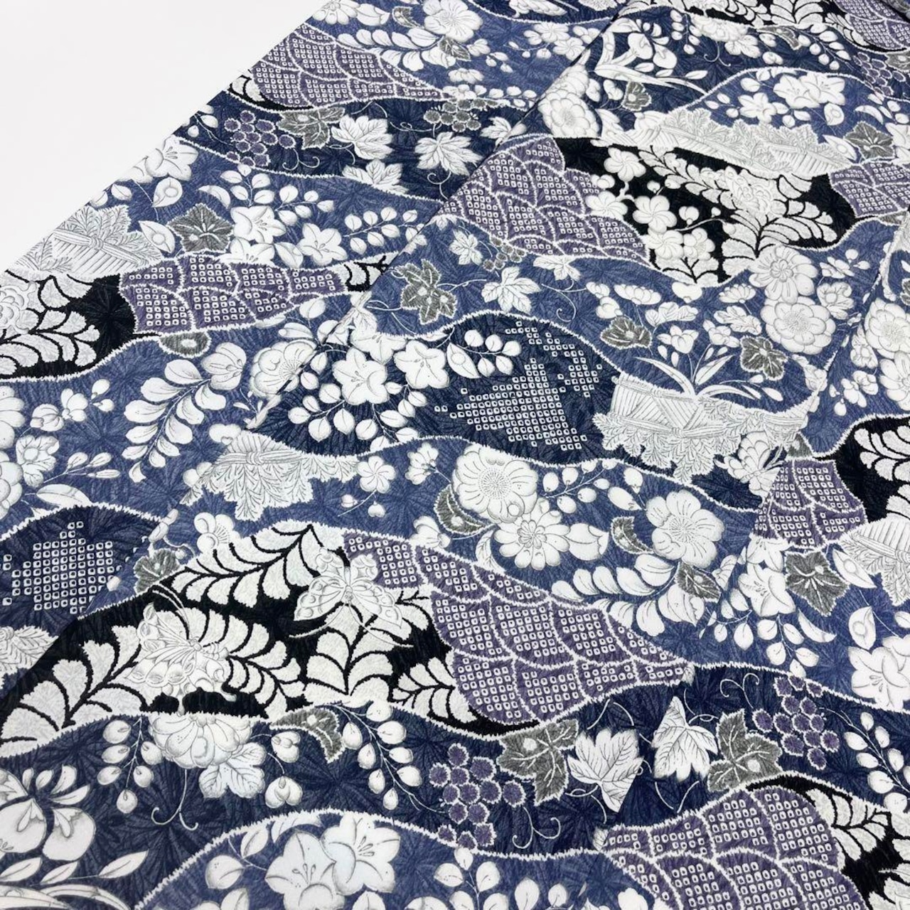 紺藤色ベースの色味の良い青味の縮緬に美しい辻が花模様がデザインされた素敵な柄裄のお品でございます。