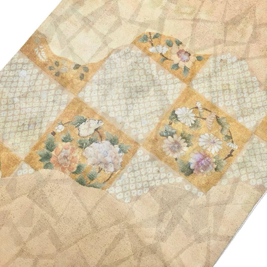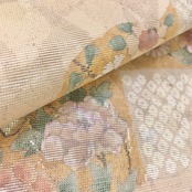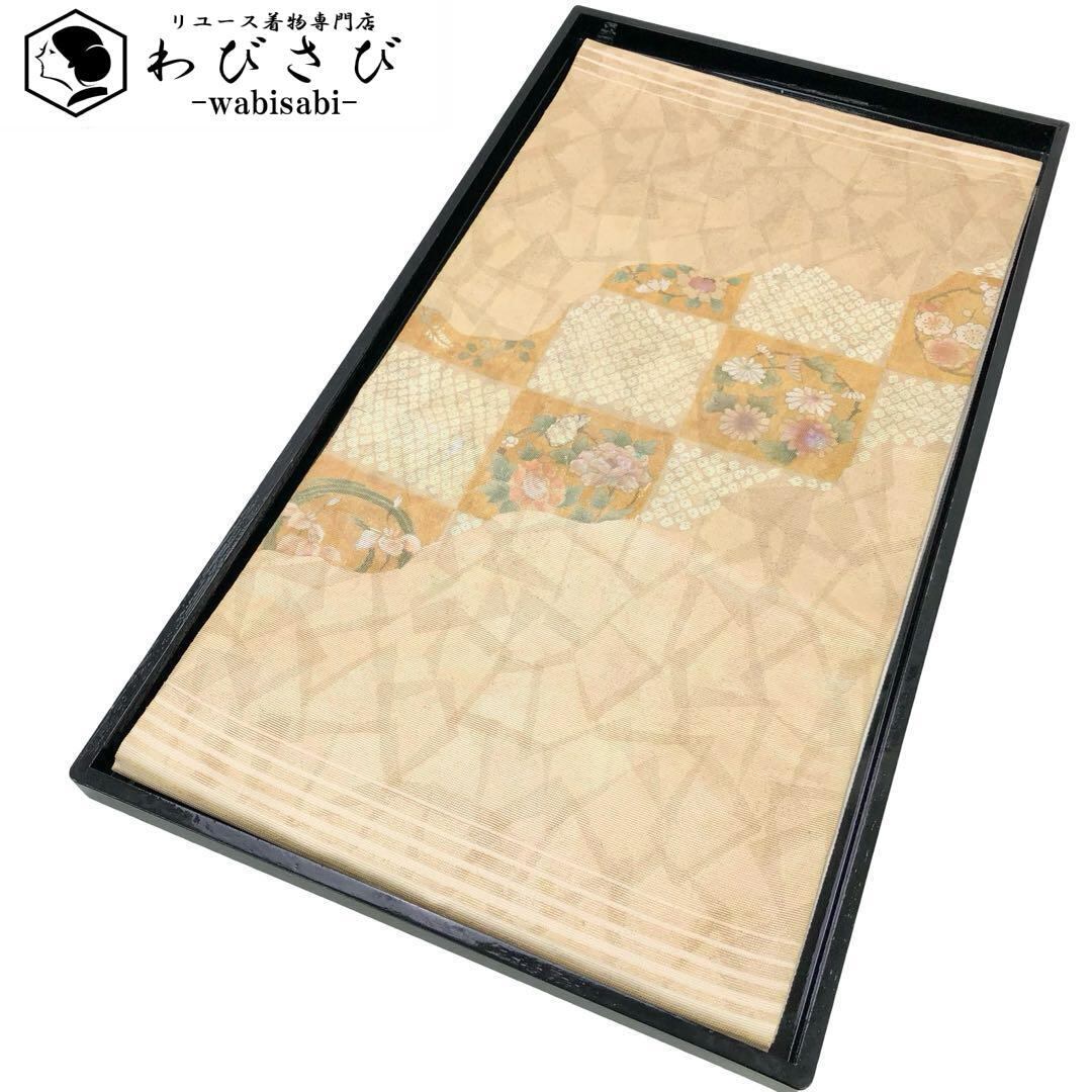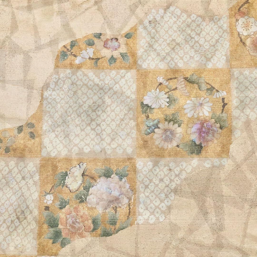 煌びやかな螺鈿、四角の中に花模様、鹿子柄がデザインされた素敵な柄裄のお品でございます。