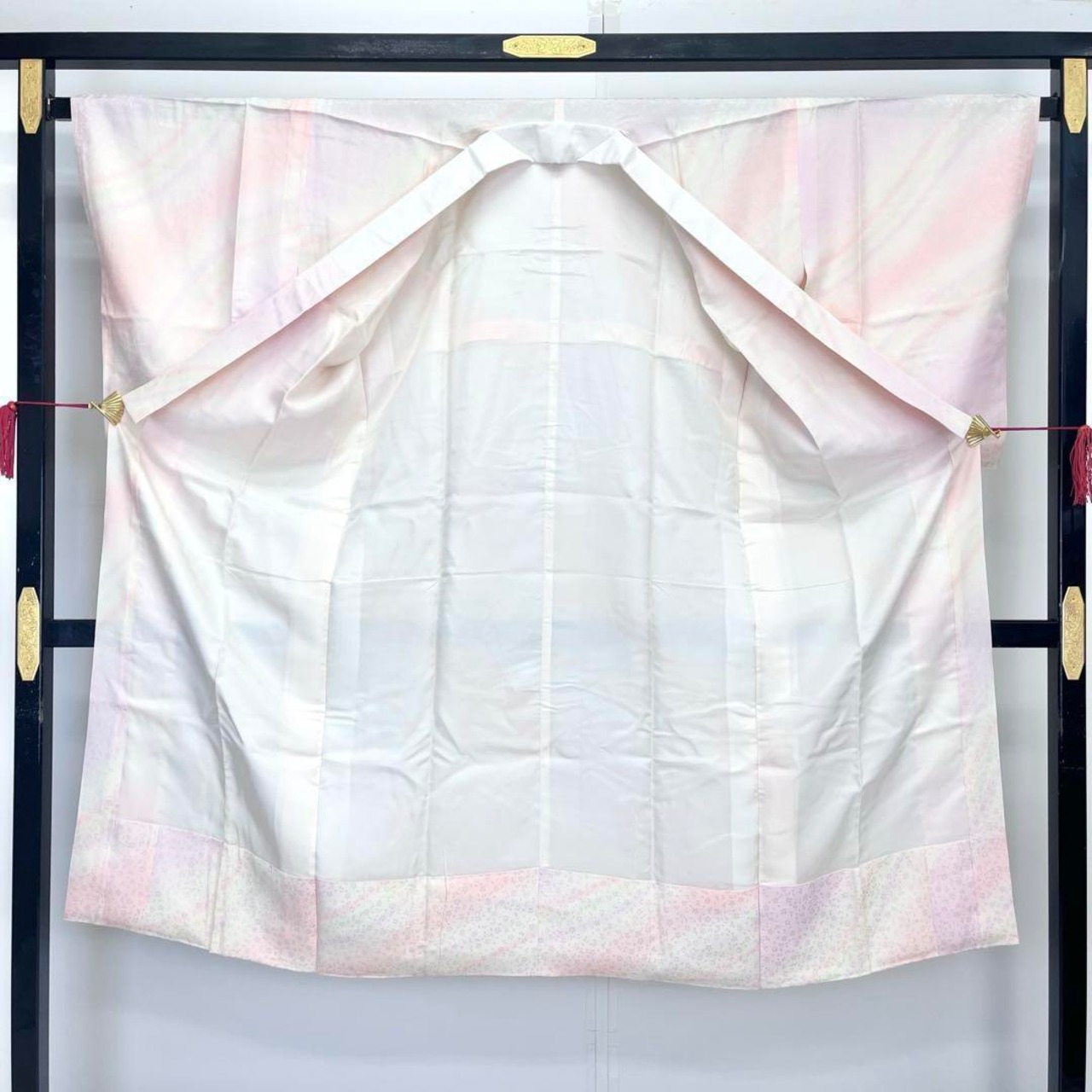 桃色ベースに淡い暈し色、曲線に桜の花びら模様がデザインされた素敵な柄裄のお品でございます。