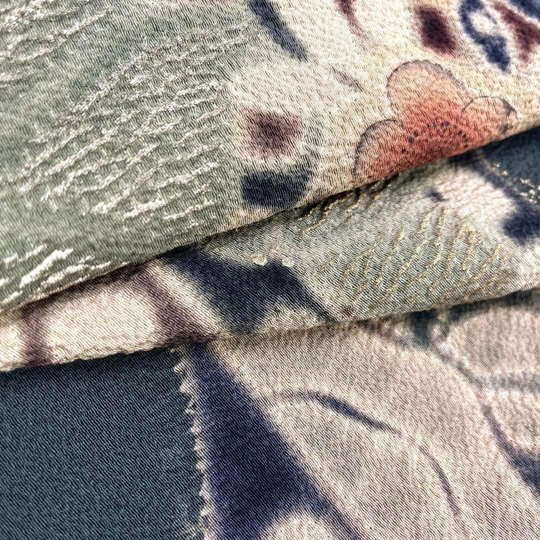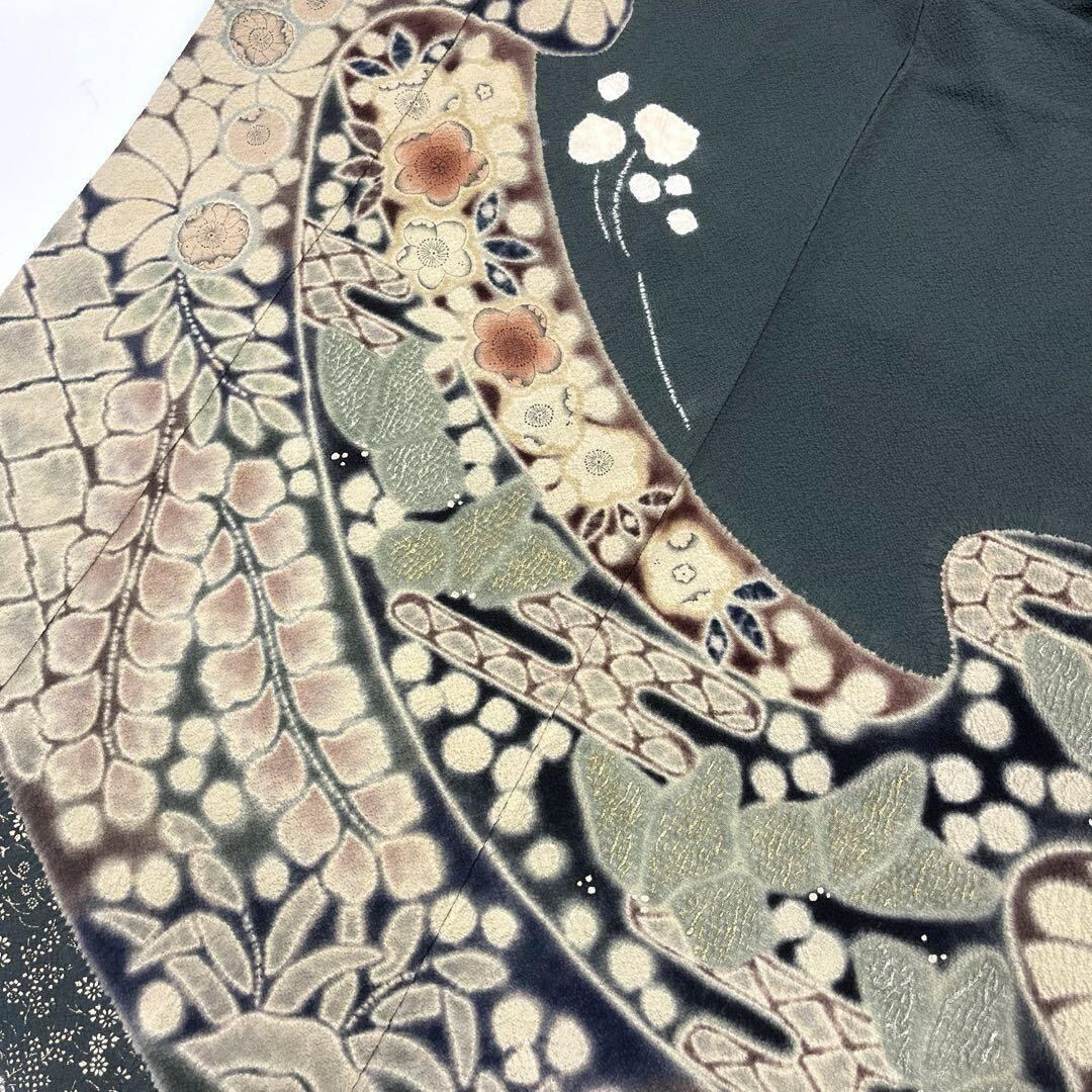 黒緑色の落ち着きのある緑味の縮緬に美しい辻が花絞りの柄裄がデザインされた素敵なお品でございます。