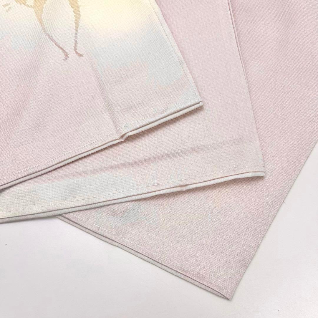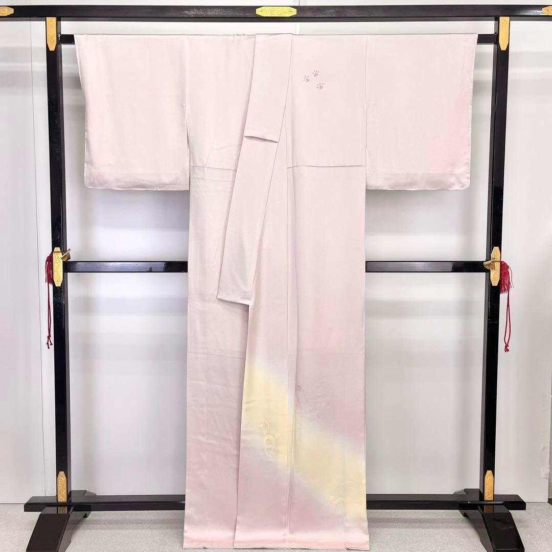 薄桃色に淡い暈し染、すらっとしたシルエットの可愛い猫柄がデザインされた素敵な柄裄のお品でございます。