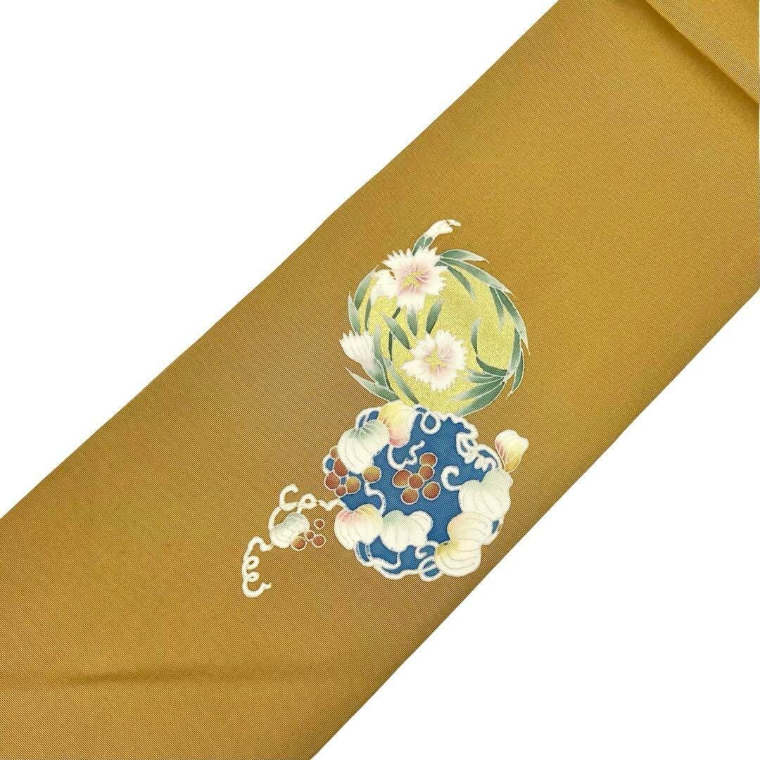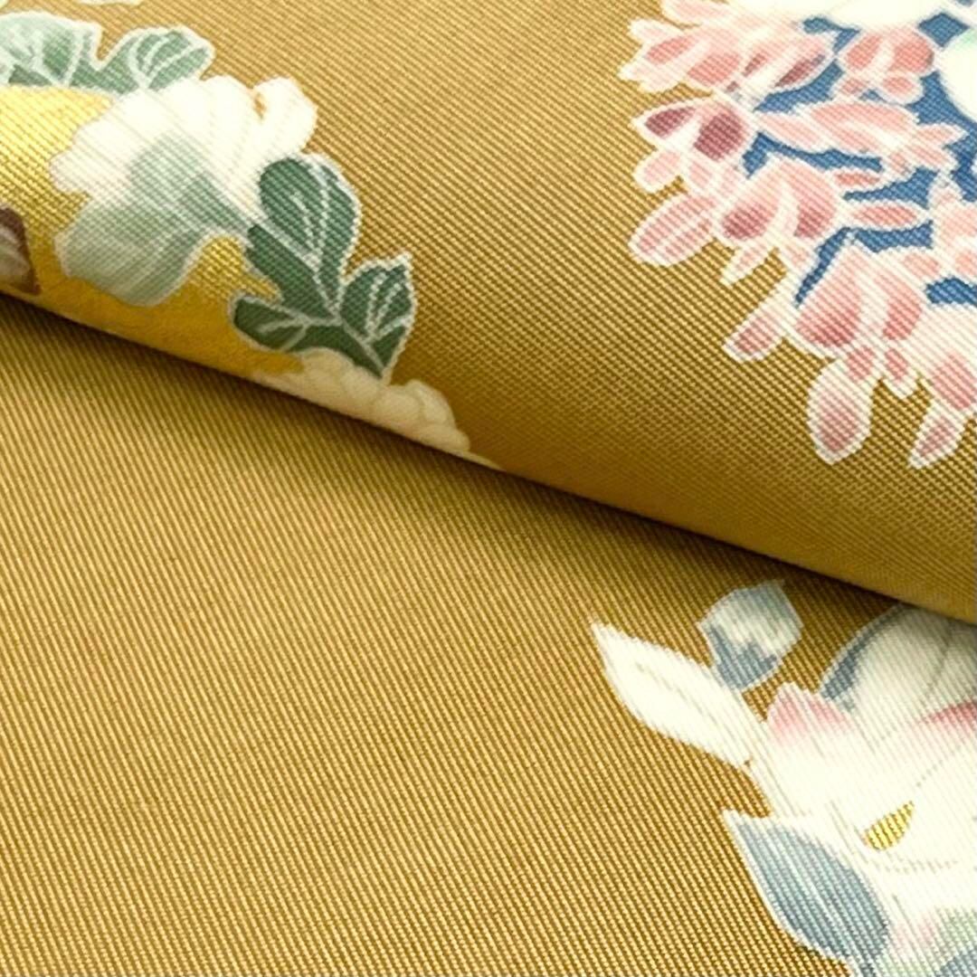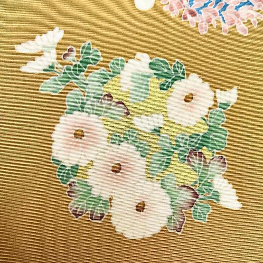 黄金色の塩瀬に萩、菊、桔梗、撫子などの丸に花模様の柄裄がデザインされた素敵なお品でございます。