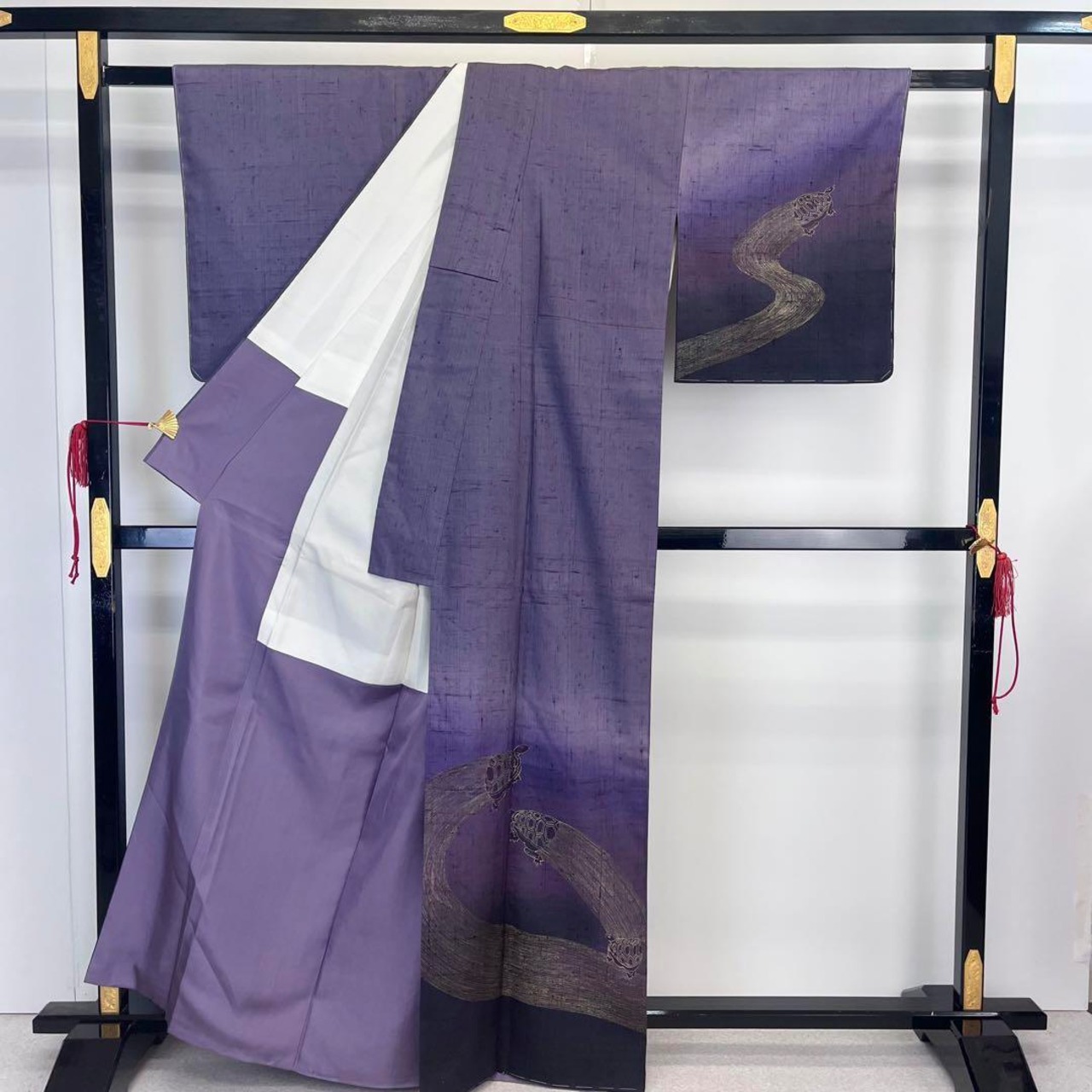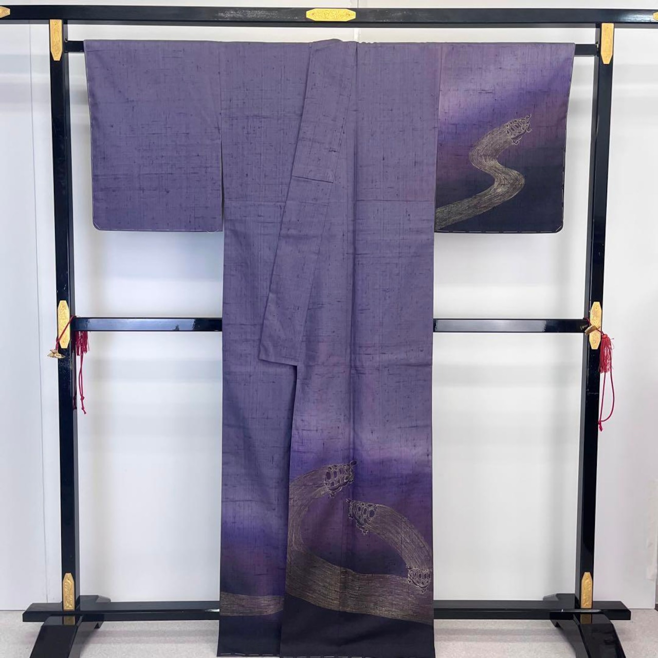 紫色の落ち着きのあるお色味の紬地に暈し、蓑亀の柄裄がデザインされた雰囲気の良い素敵な柄裄のお品でございます。