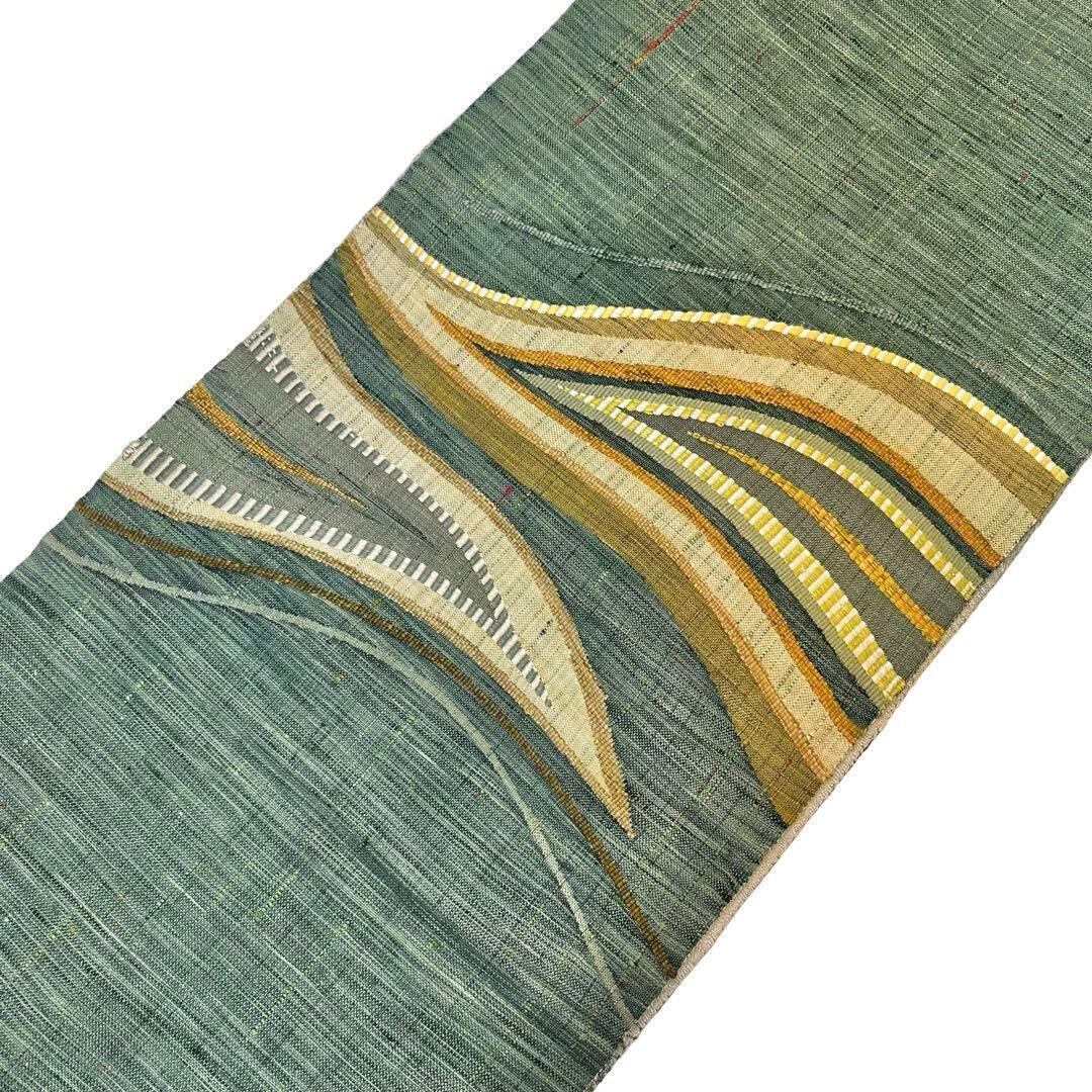 曲線模様がデザインされた雰囲気の良い灰緑色ベースの紬の素敵なお品でございます。
