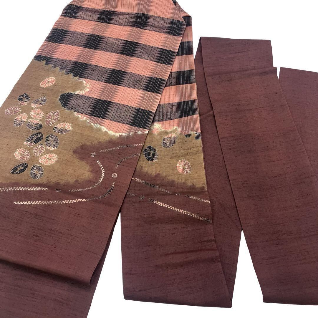 名古屋帯 絞りの花柄模様 紬 チェック柄 濃茶色 O-4118 着物 きもの kimono 和服 和装 中古 リサイクル着物 【送料無料】