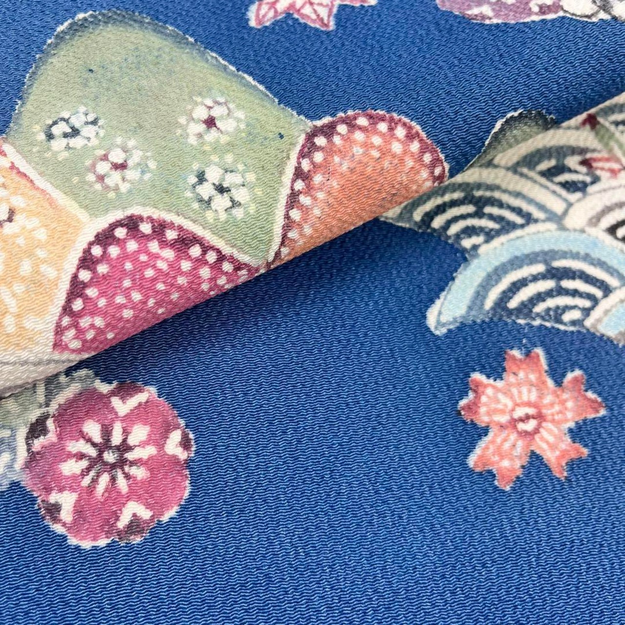 青黛色の縮緬に色鮮やかな山々に紅葉などの風景柄がデザインされた素敵な柄裄のお品でございます。