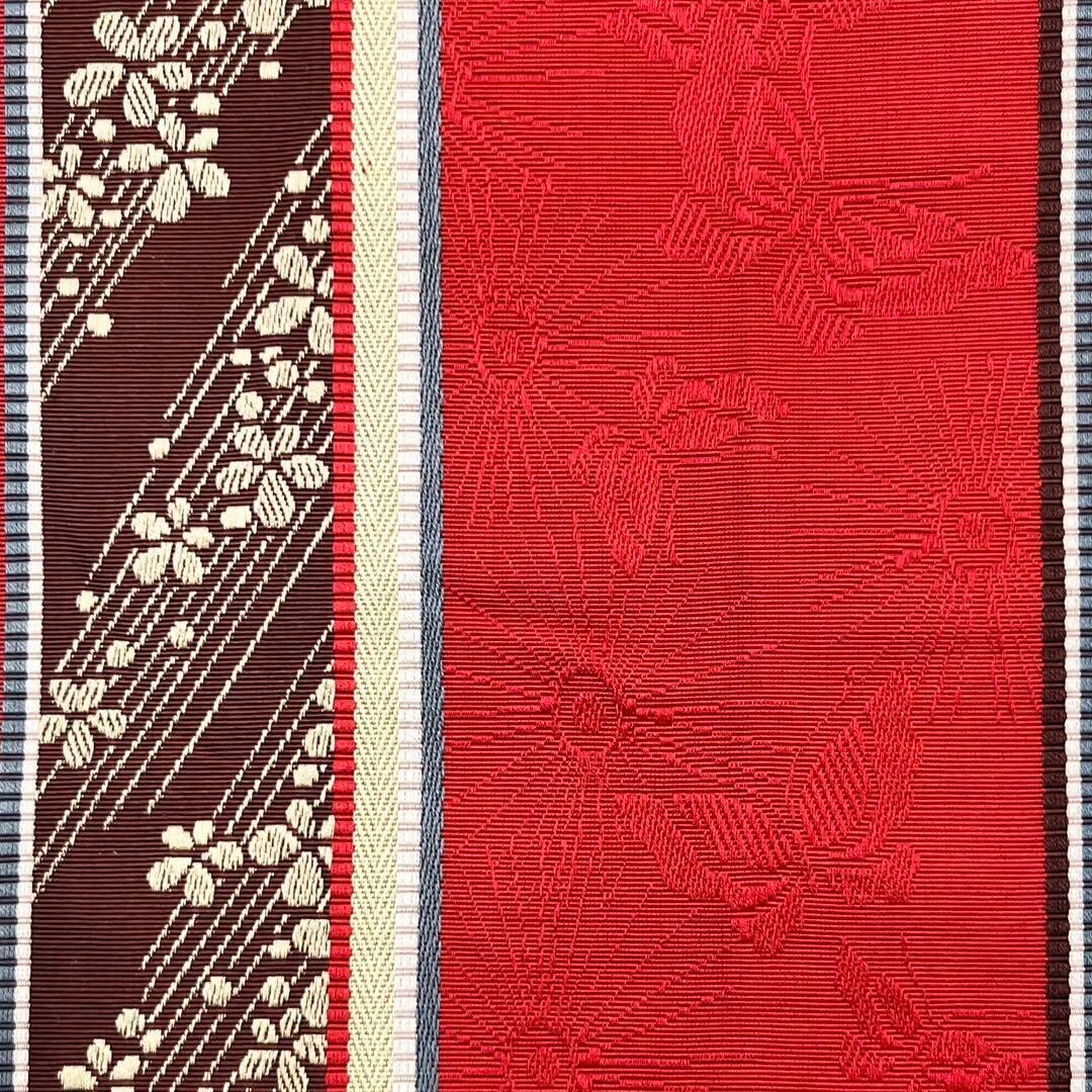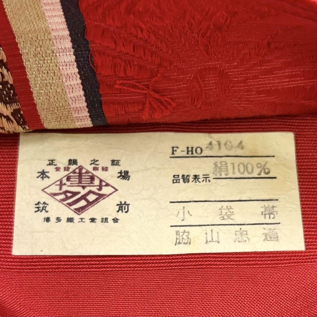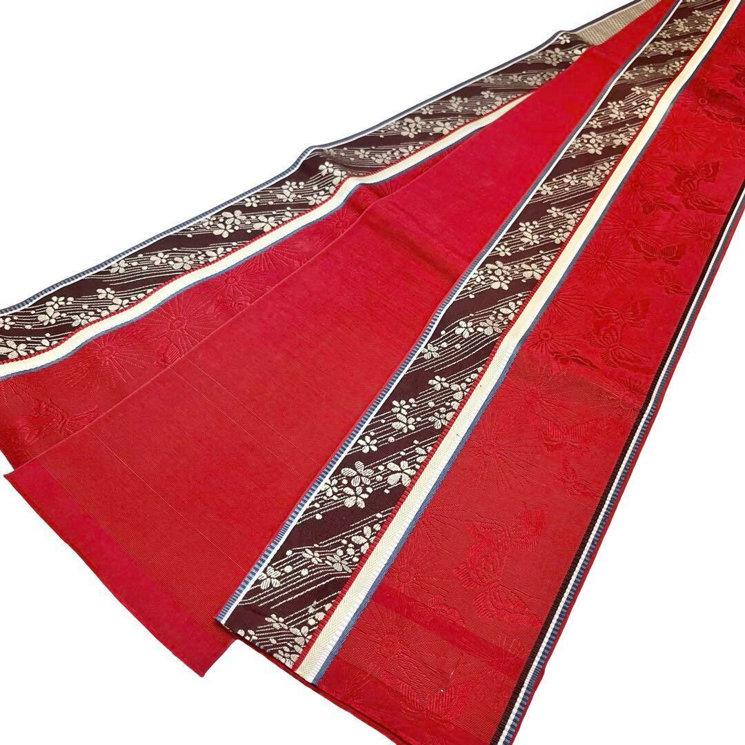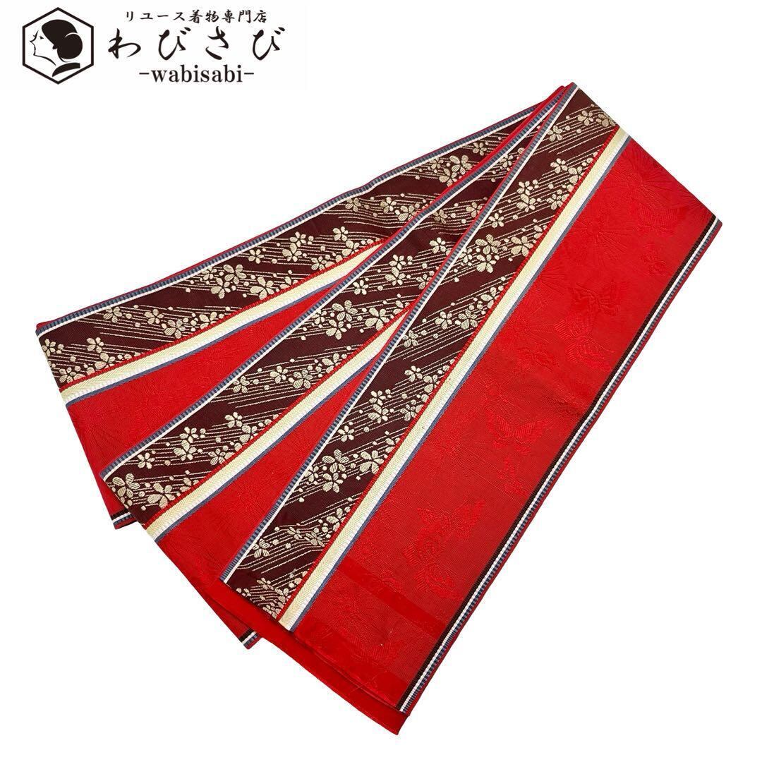 半幅帯 本場筑前博多織 証紙付 縦縞 花模様 蝶々 赤色 O-4108