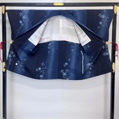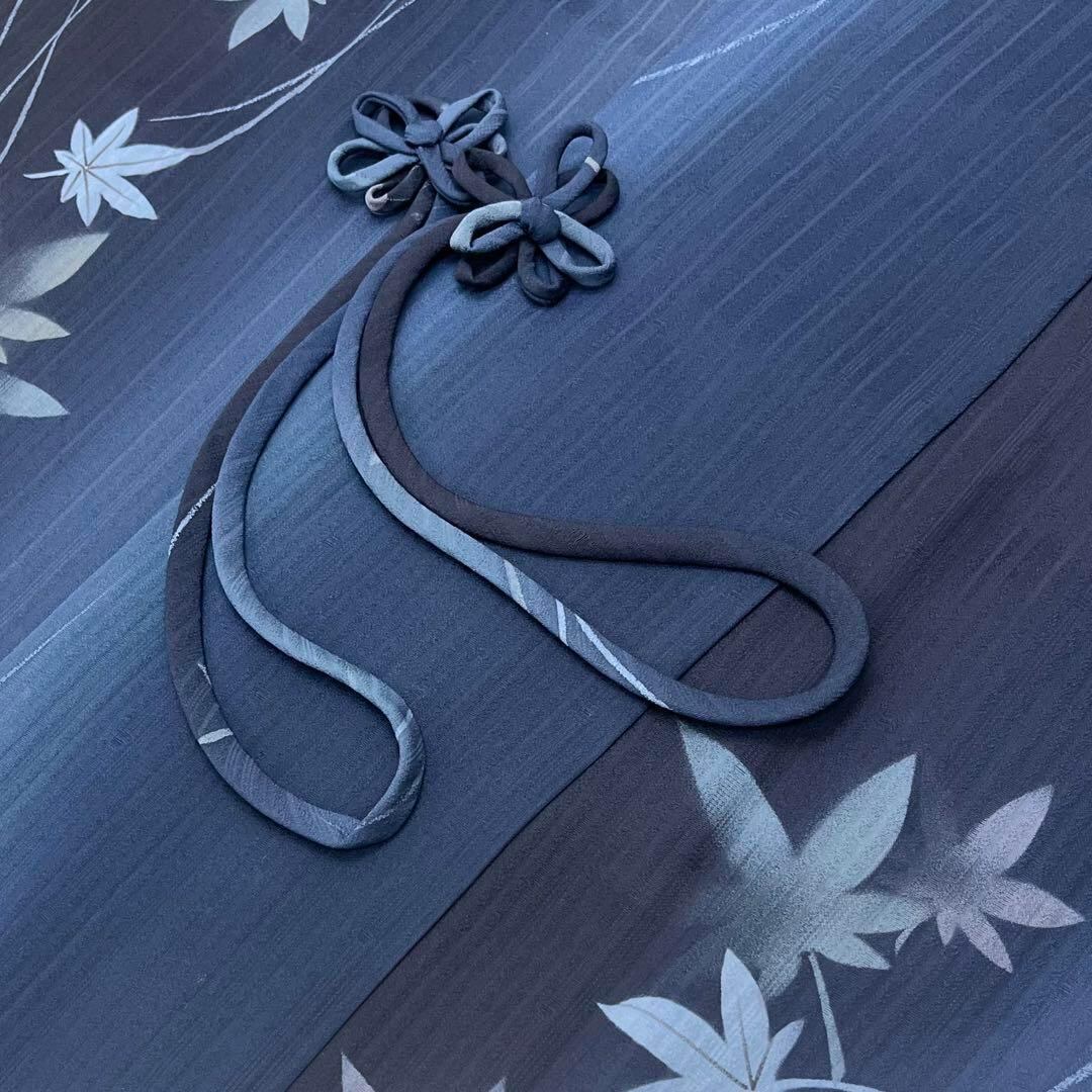 濃紺色に縦柄の暈し、紅葉の柄裄がデザインされた素敵なお品でございます。