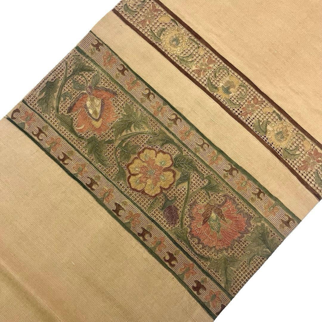 名古屋帯 相良刺繍 汕頭刺繍 横段花模様 紬 胡桃色 O-4122 着物 きもの kimono 和服 和装 中古 リサイクル着物 【送料無料】