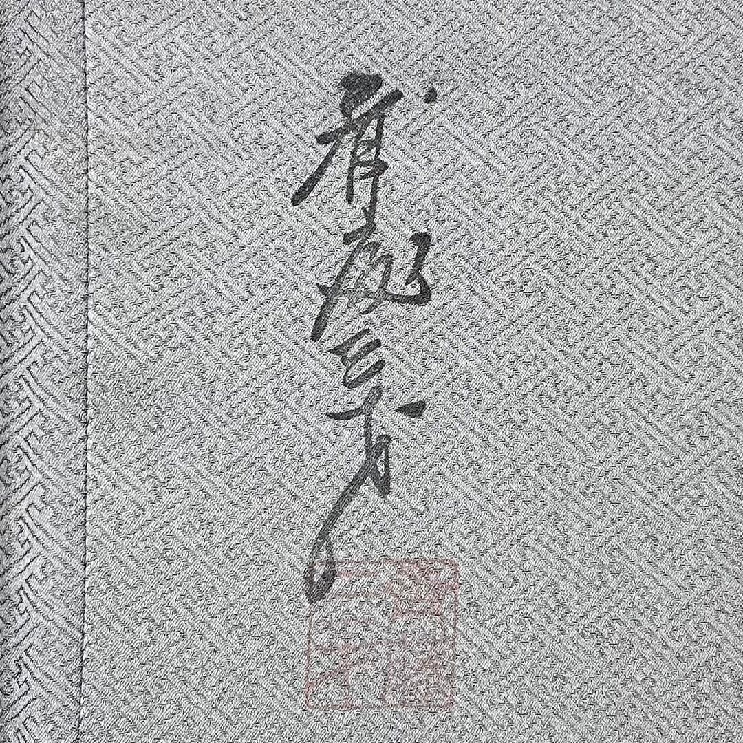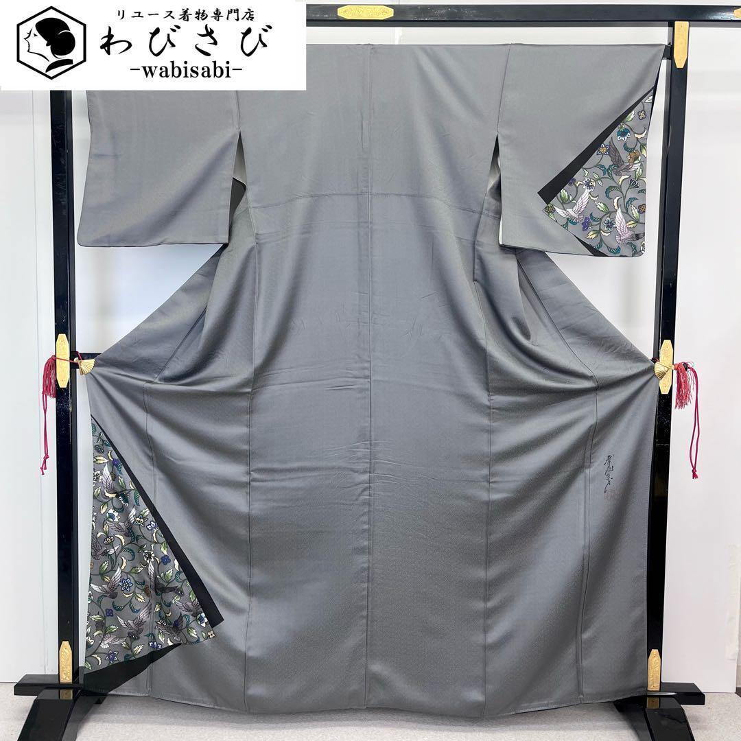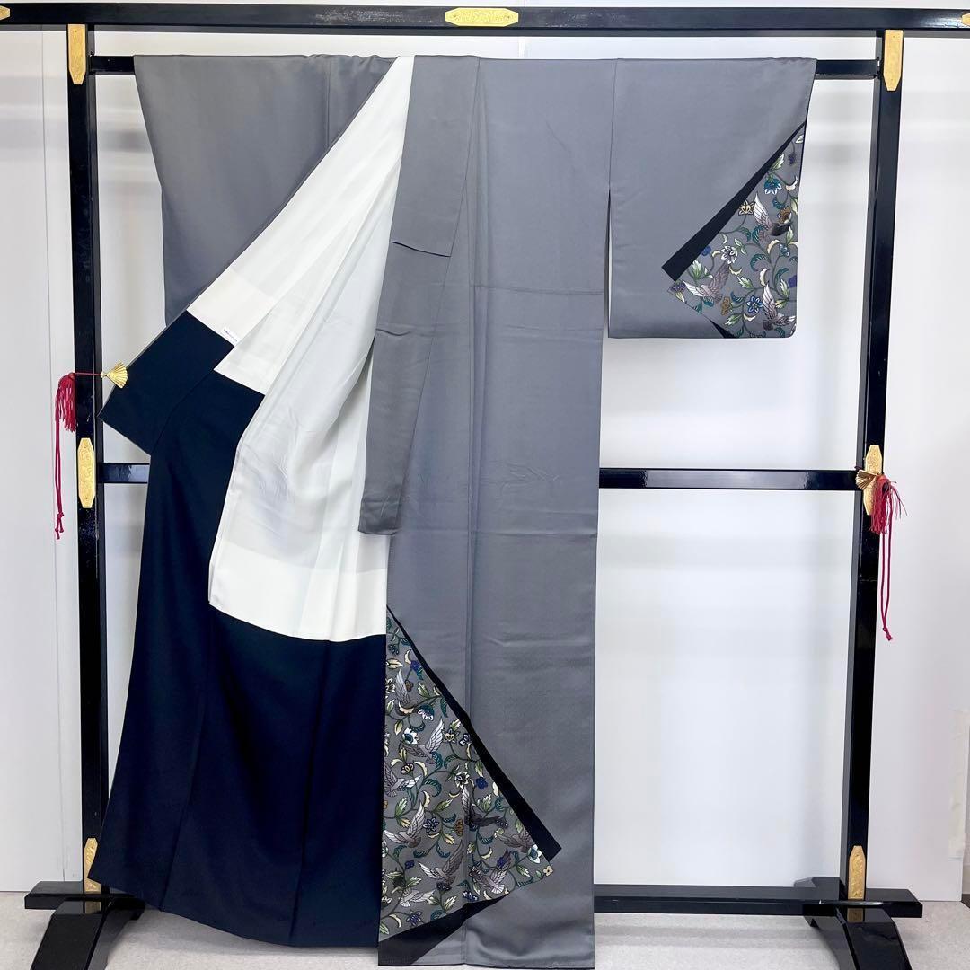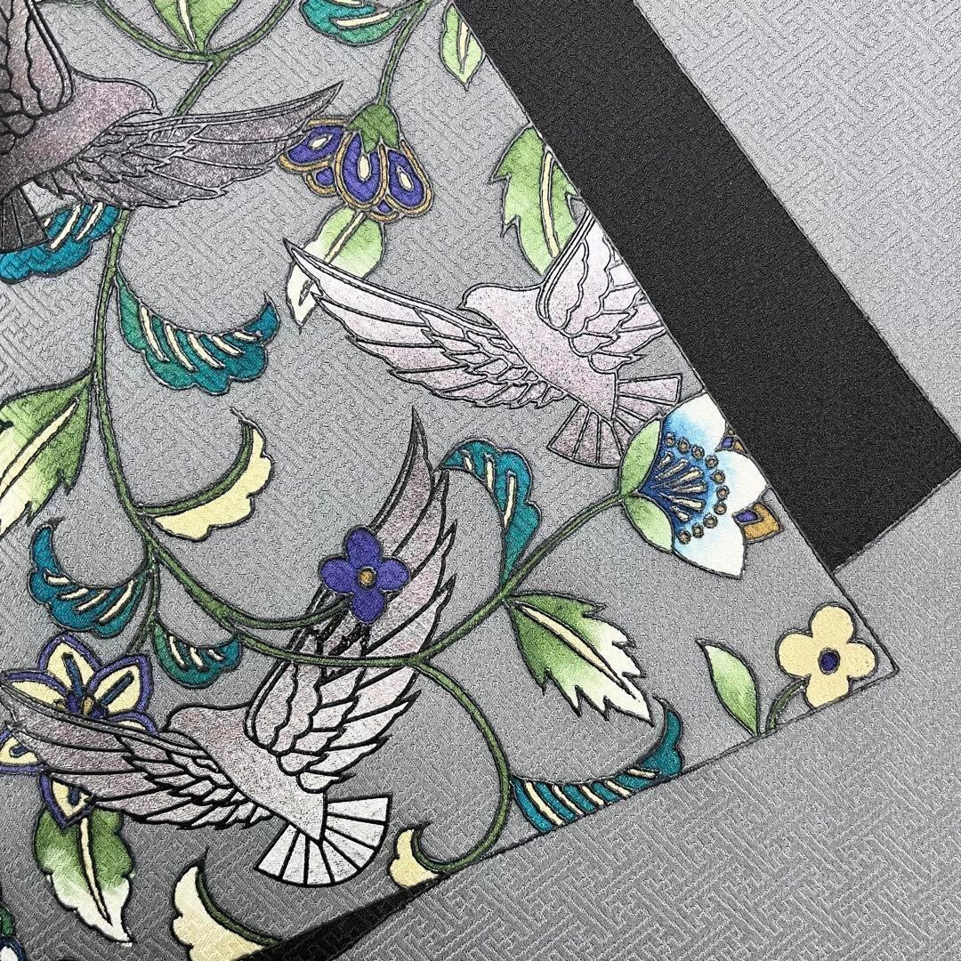 灰色のお色味にモダンな雰囲気の花唐草模様に三才鳥がデザインされた素敵な柄裄のお品でございます。