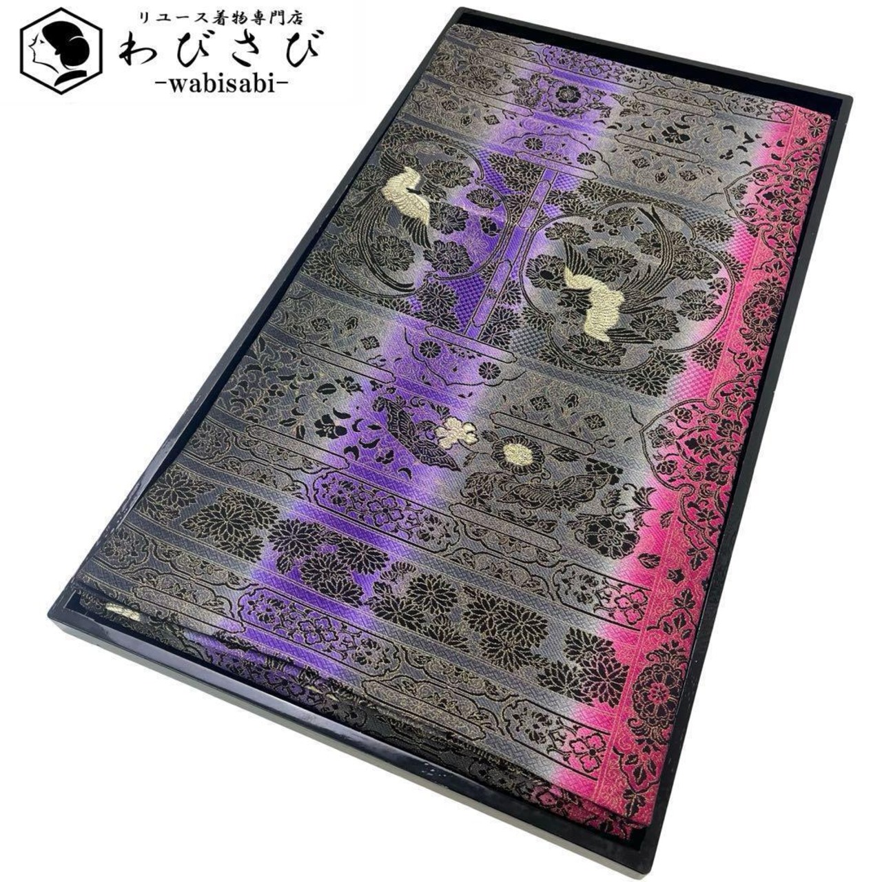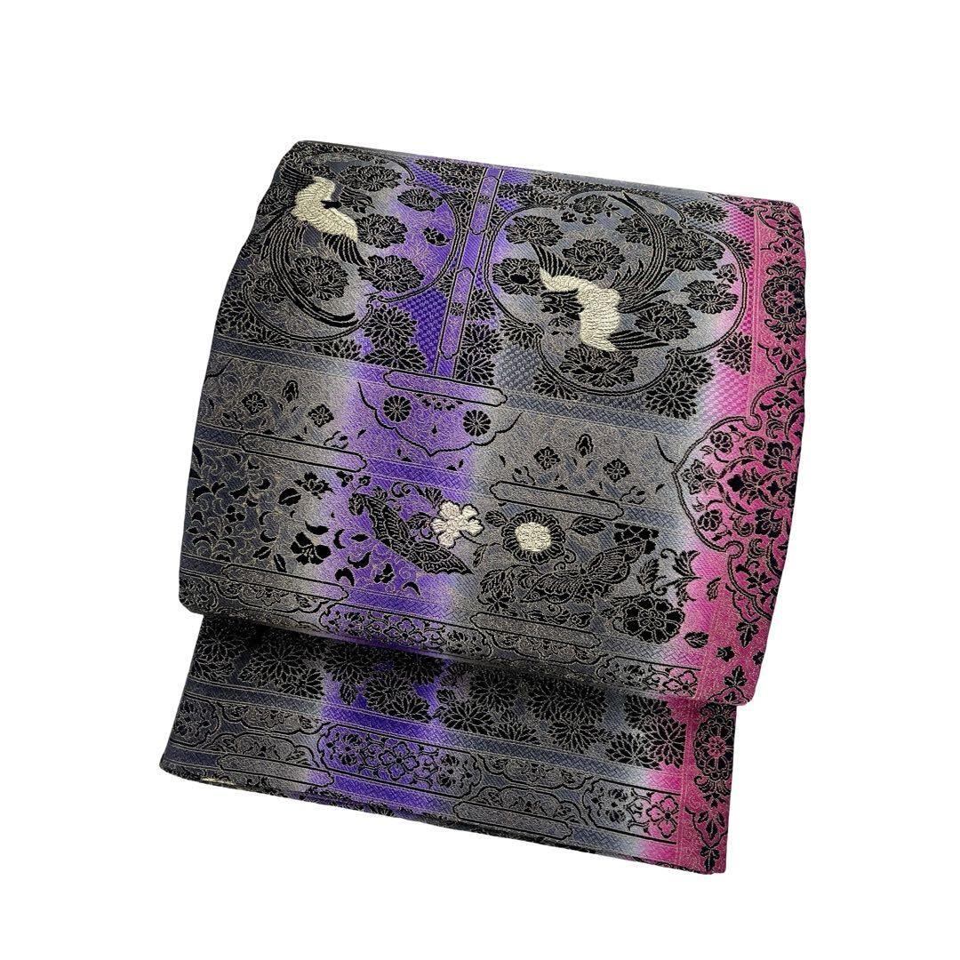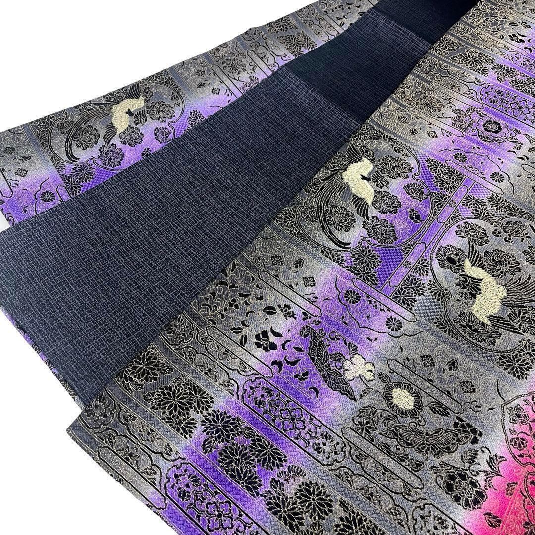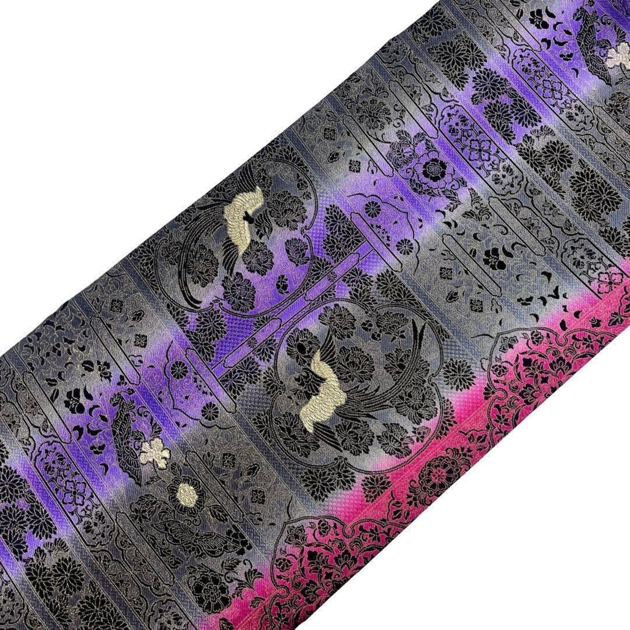 袋帯 前田仁仙 鳳凰に花柄模様 縦柄グラデーション 紺鼠色 O-4124 着物 きもの kimono 和服 和装 中古 リサイクル着物 【送料無料】