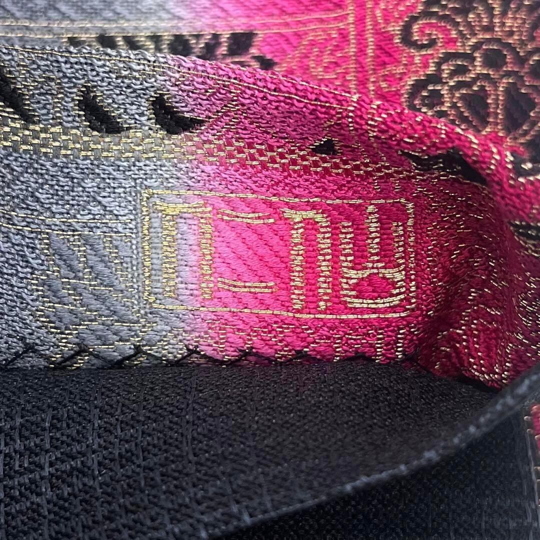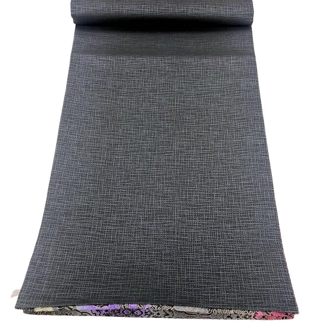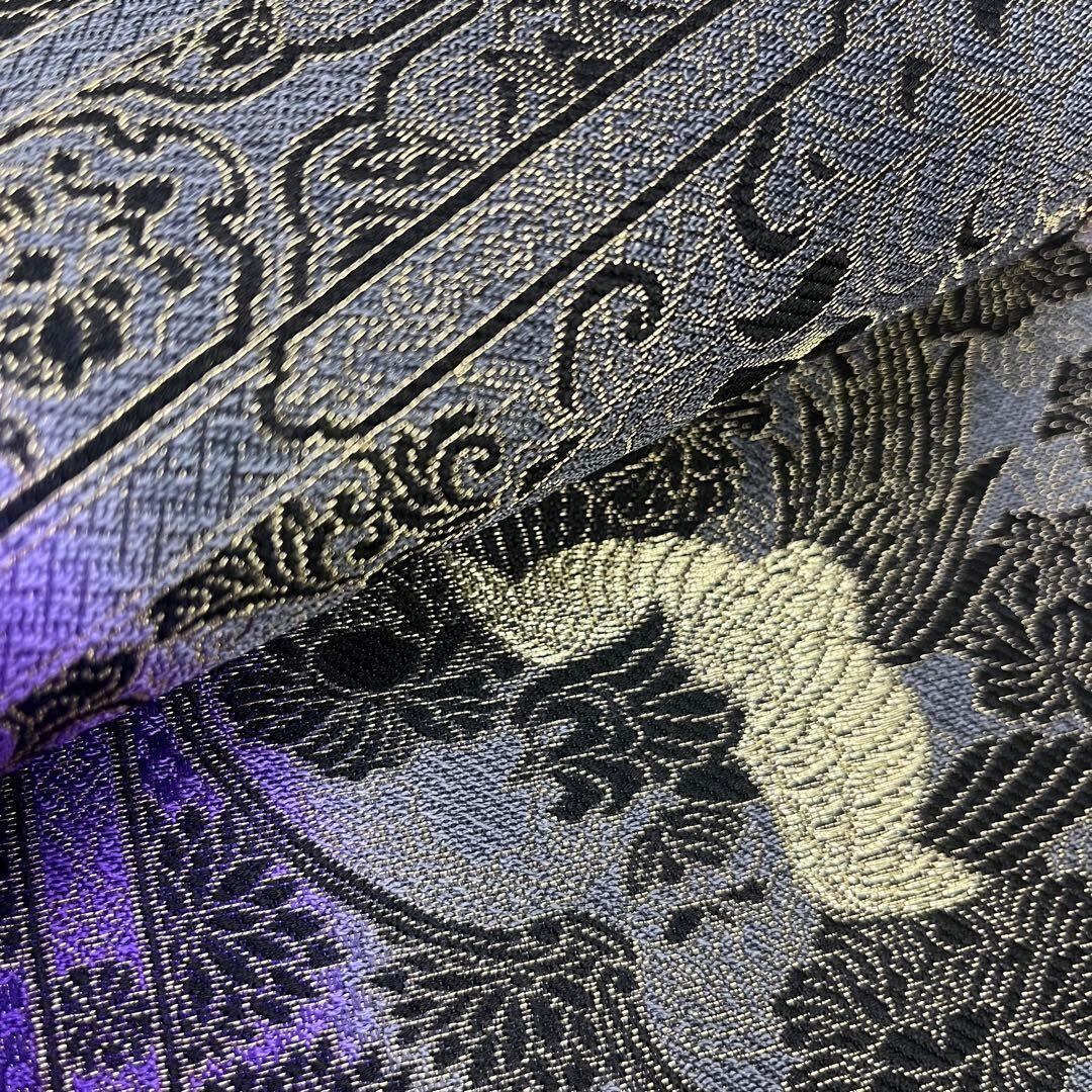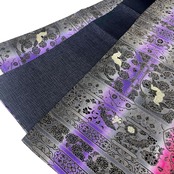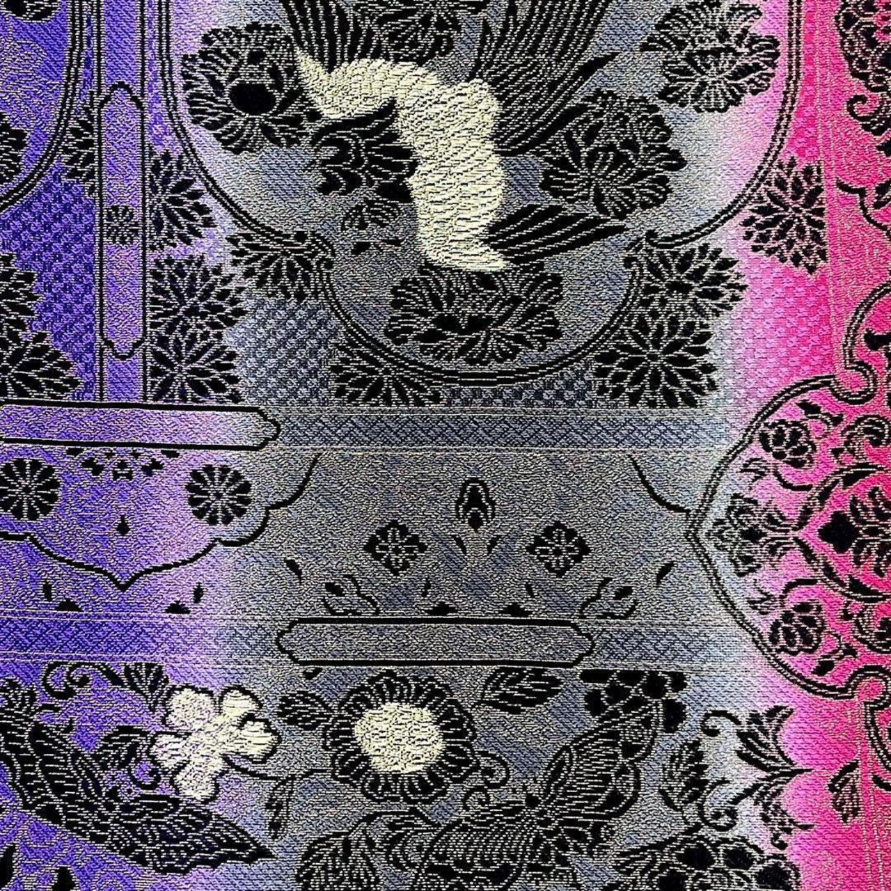 紺鼠色ベースのお色味に縦柄グラデーション、美しい鳳凰に花柄模様がデザインされた色使い鮮やかな素敵な柄行のお品でございます。