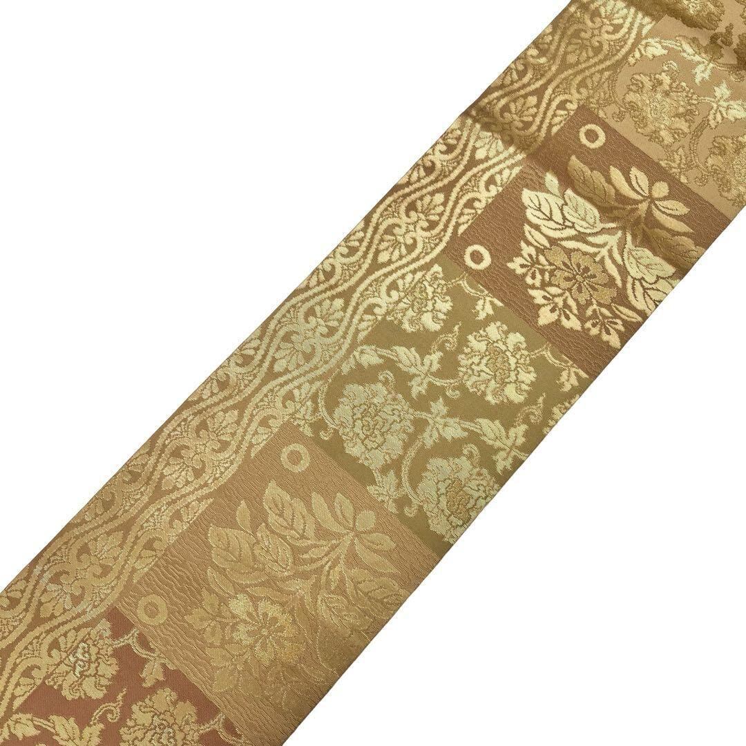 名古屋帯 花唐草模様 格子柄 金茶色 金糸 O-4114 着物 きもの kimono 和服 和装 中古 リサイクル着物 【送料無料】