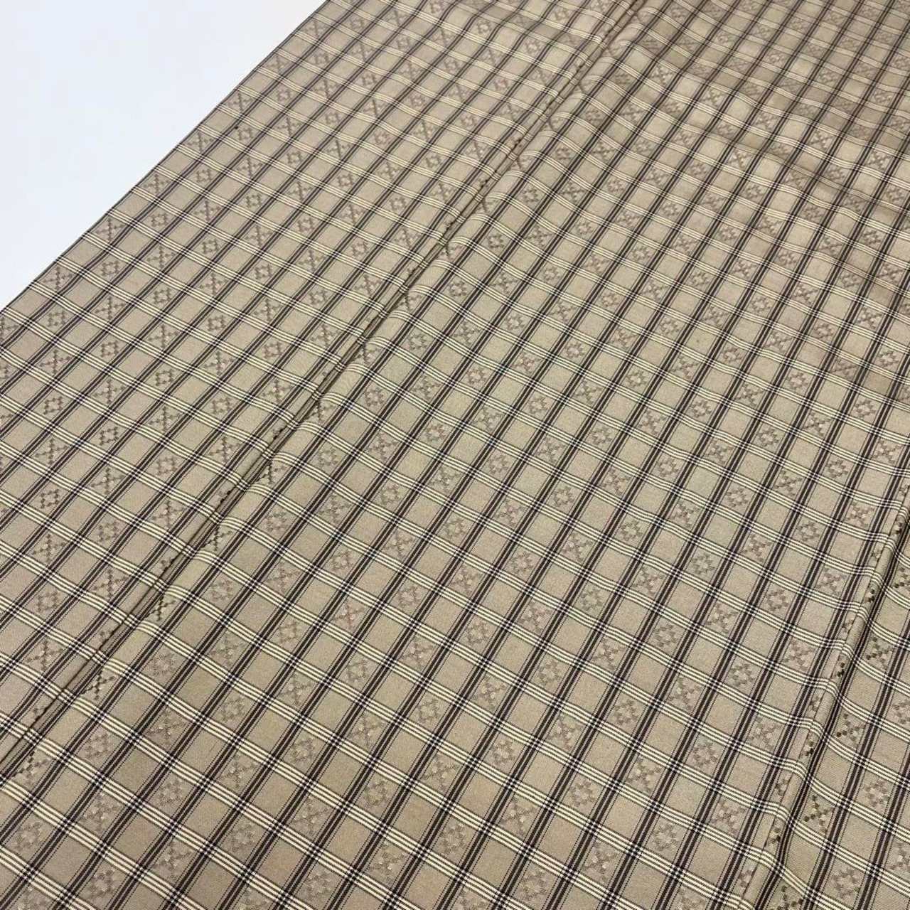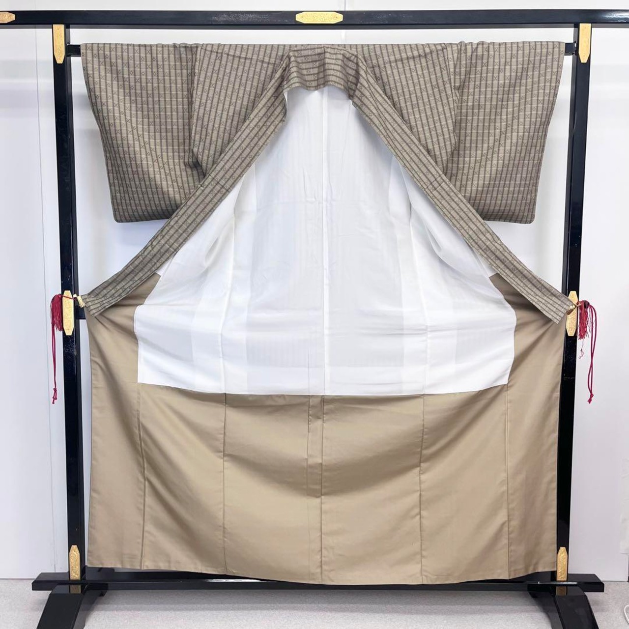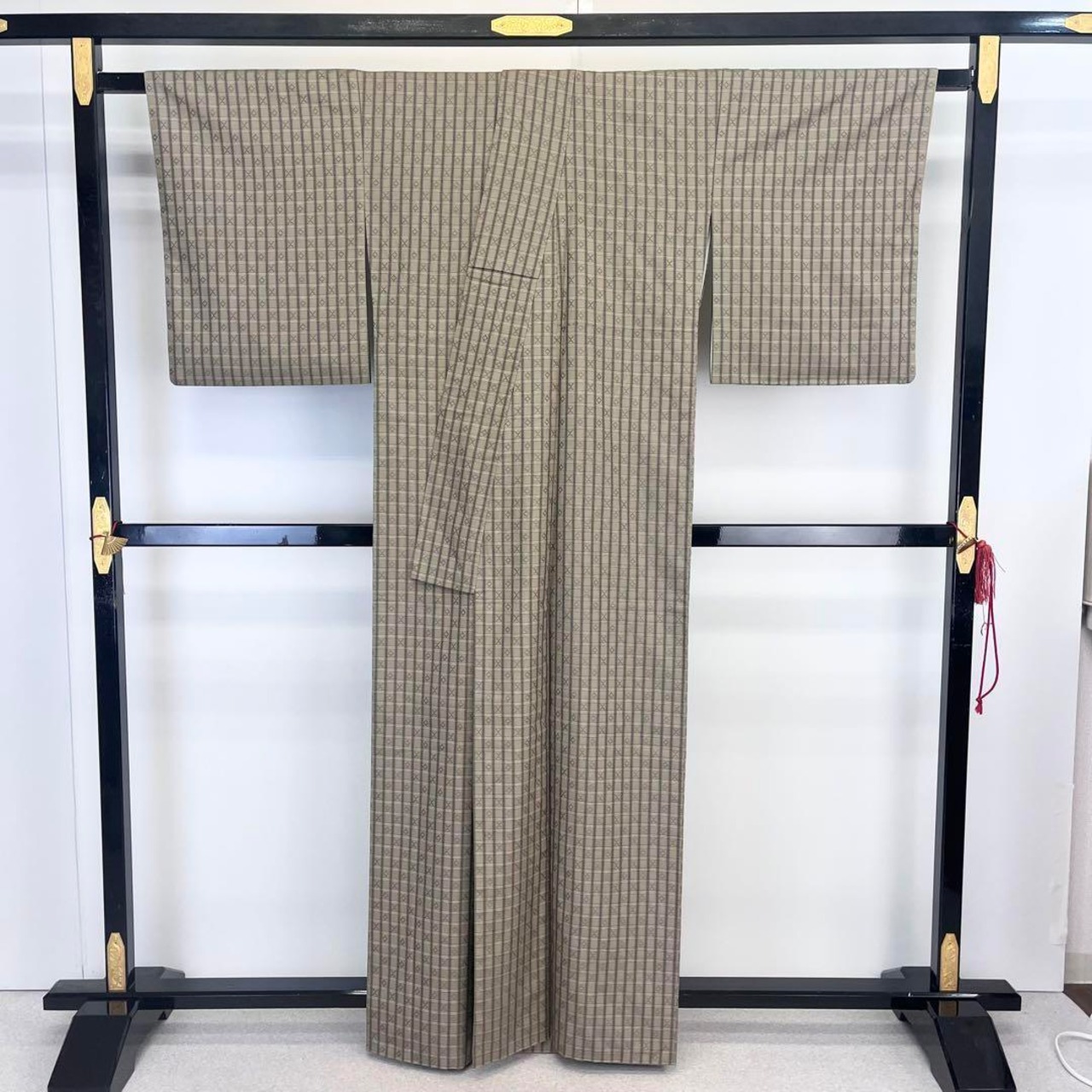 生壁色の落ち着きのあるお色味に格子柄、花織の柄裄がデザインされた素敵なお品でございます。