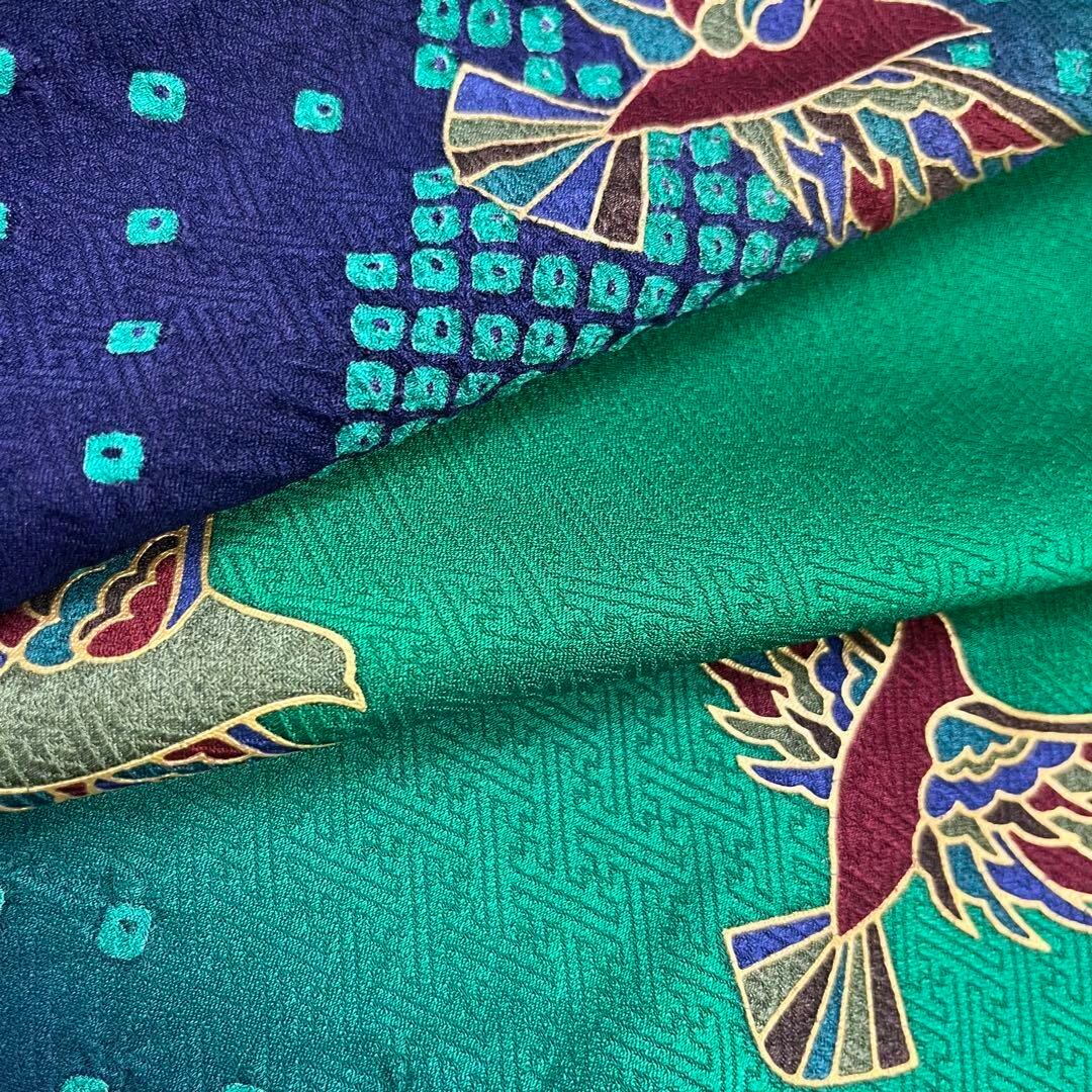 緑色ベースのお色味に紗綾形の地模様、鹿の子絞り柄に三才鳥がデザインされた素敵な柄裄のお品でございます。