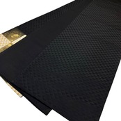 黒色に鱗の地模様、太鼓、前柄にも市松模様に鱗模様、箔散らしの柄裄がデザインされたモダンな雰囲気の素敵なお品でございます。
