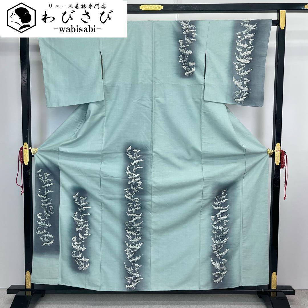 豆青色の品のあるお色味の紬に暈し、植物の柄裄がデザインされた素敵な柄裄のお品でございます。