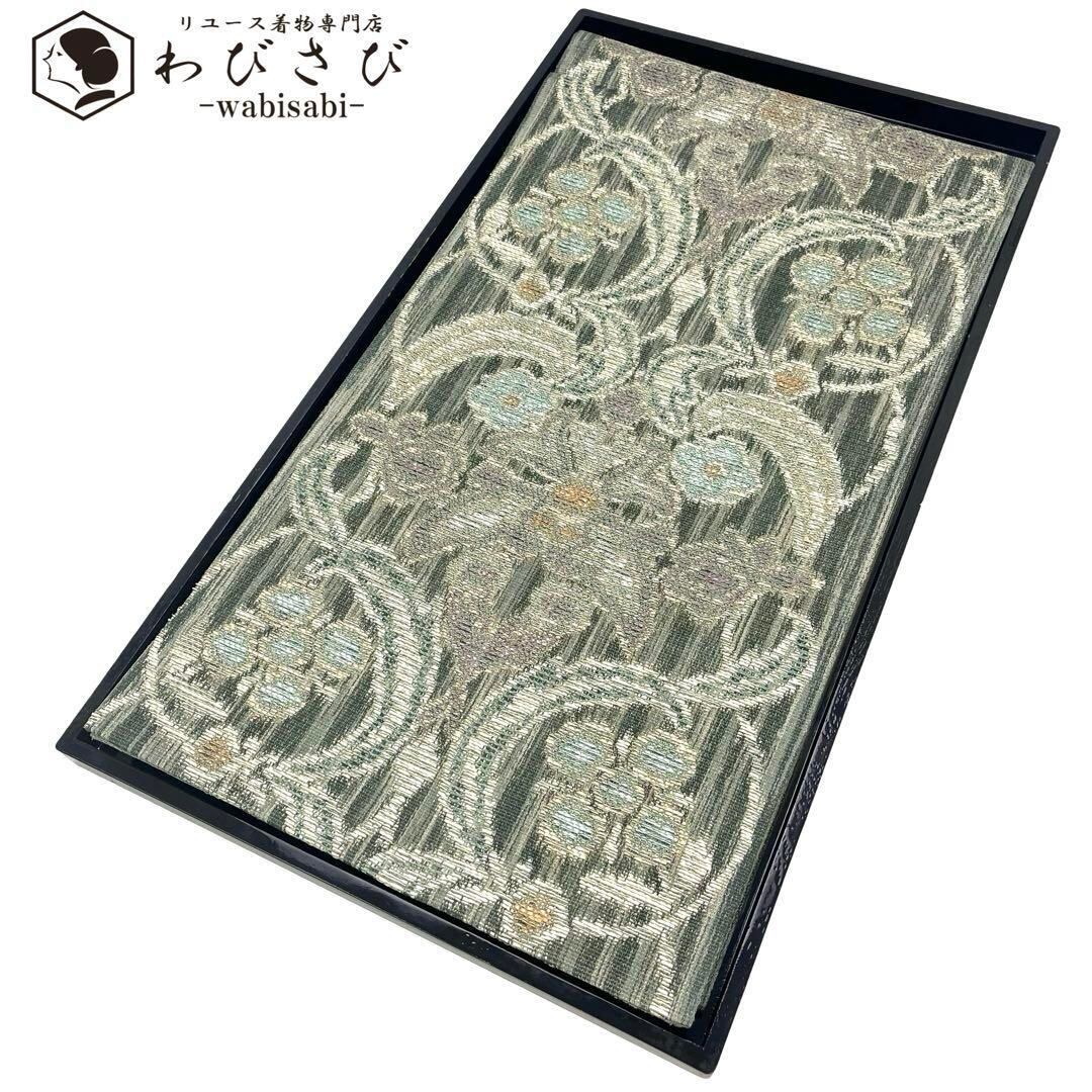 袋帯 抽象花唐草 縦柄模様 灰緑色 金糸 O-4148