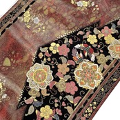 海老茶色ベースの落ち着きのあるお色味に向かい鳥、華柄模様がデザインされた素敵な柄行のお品でございます。