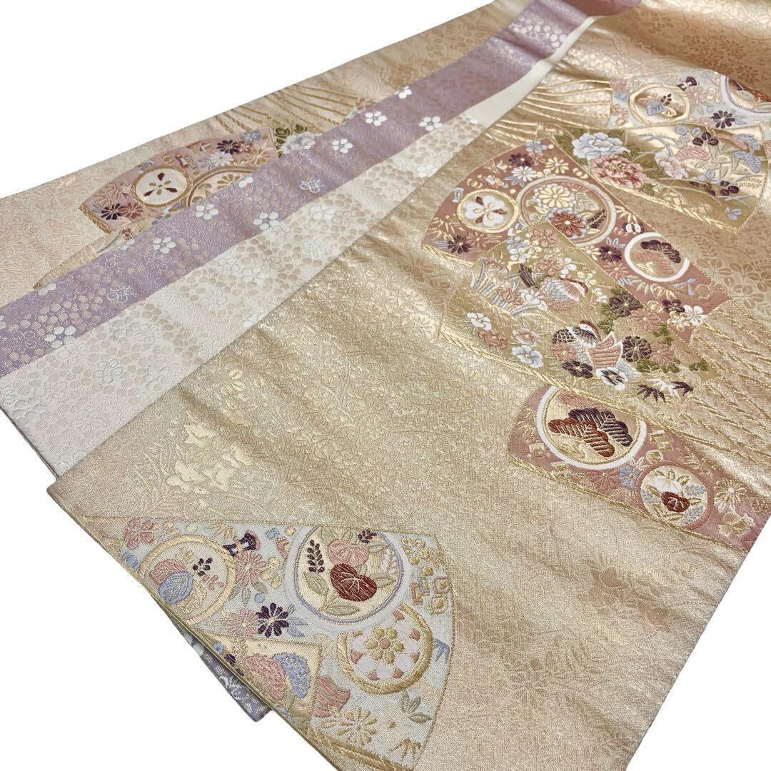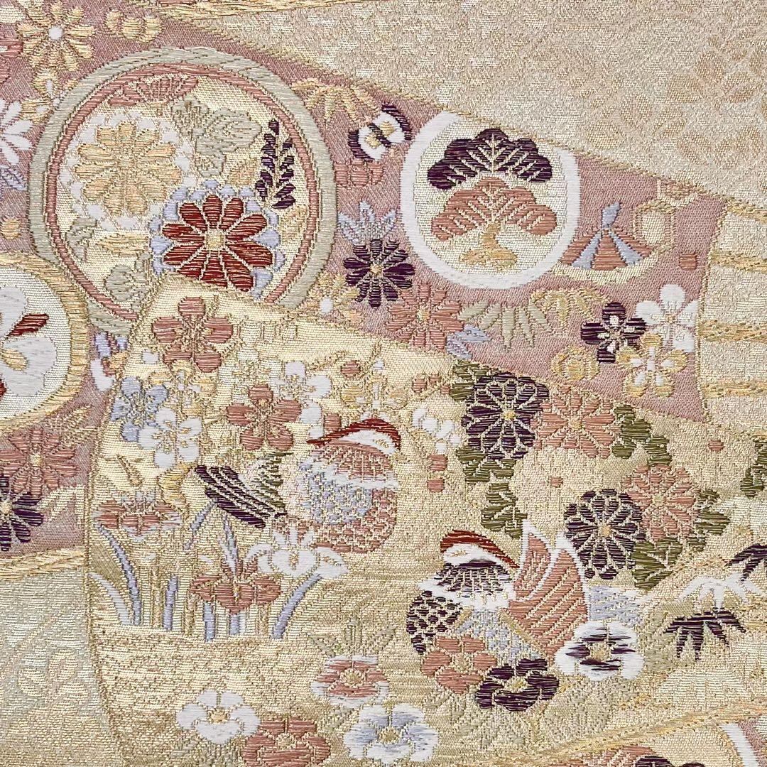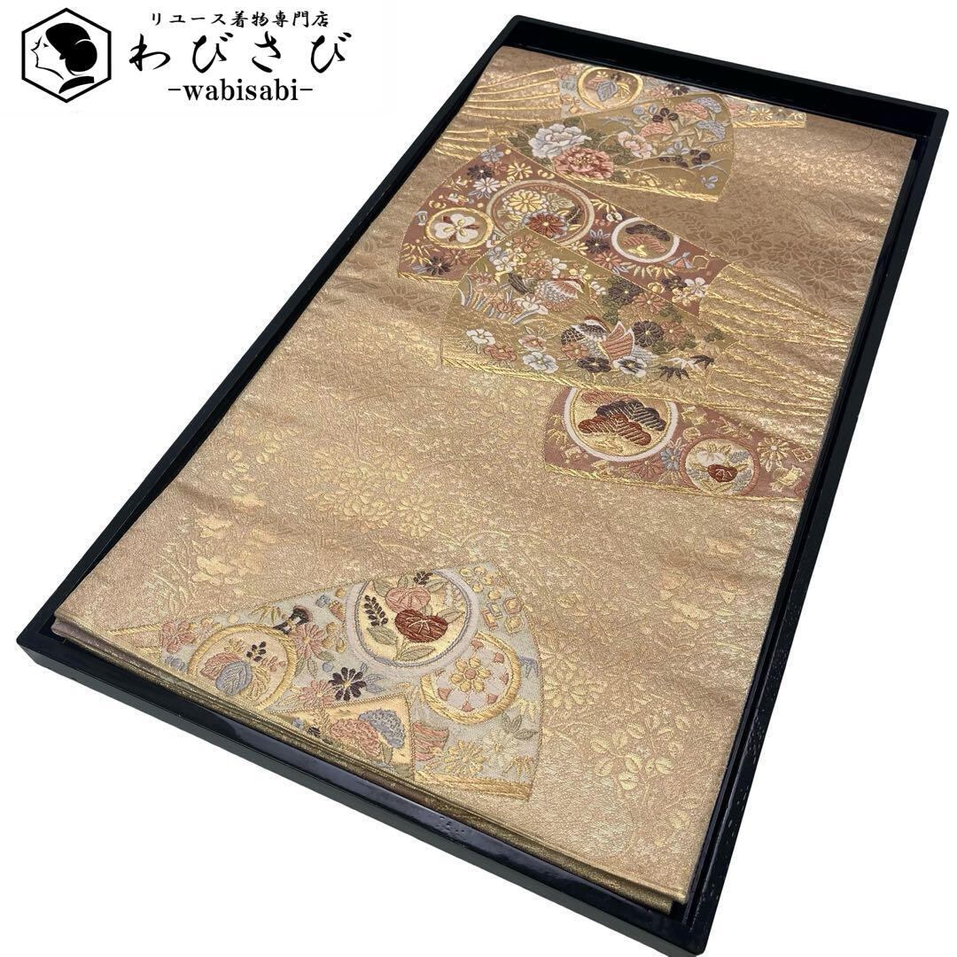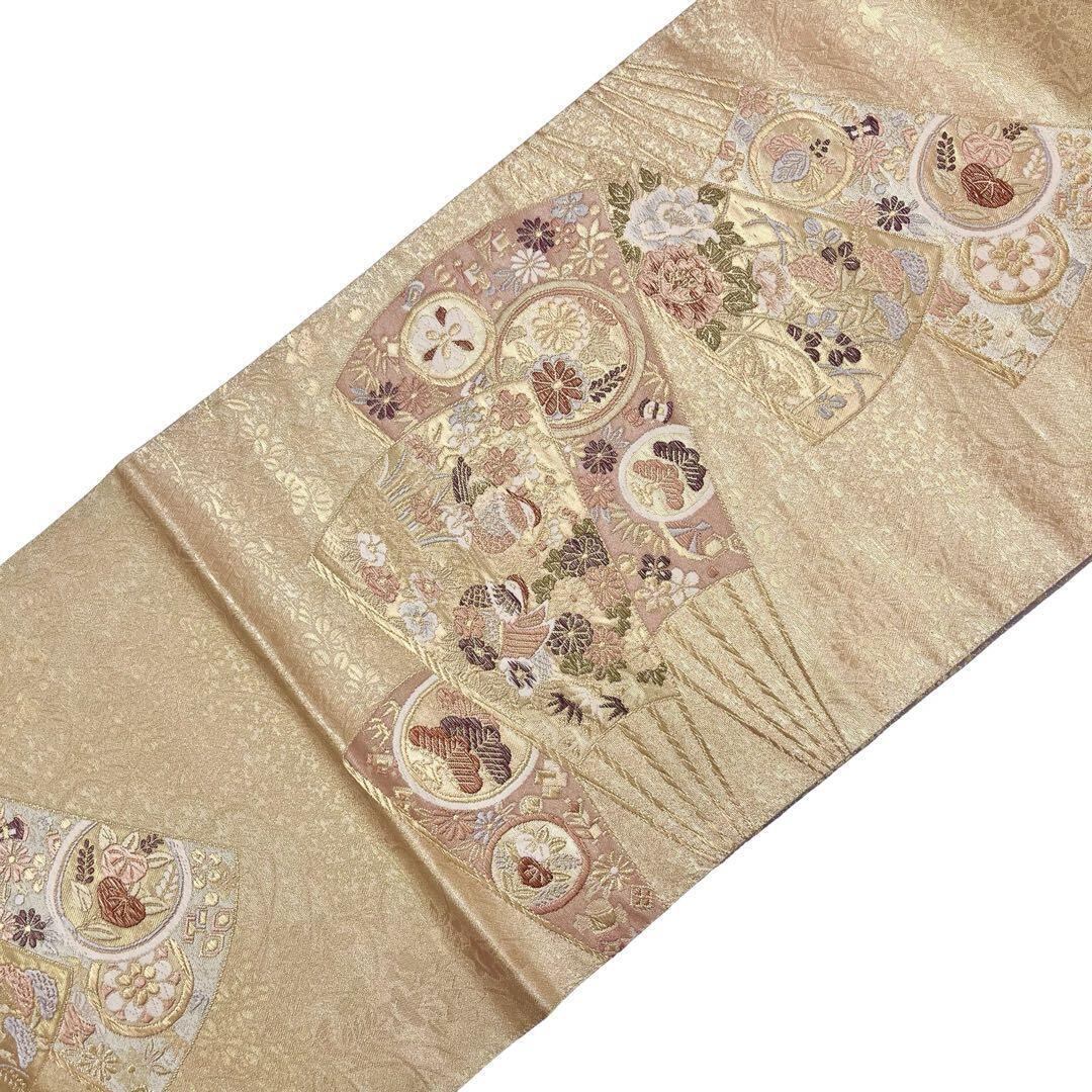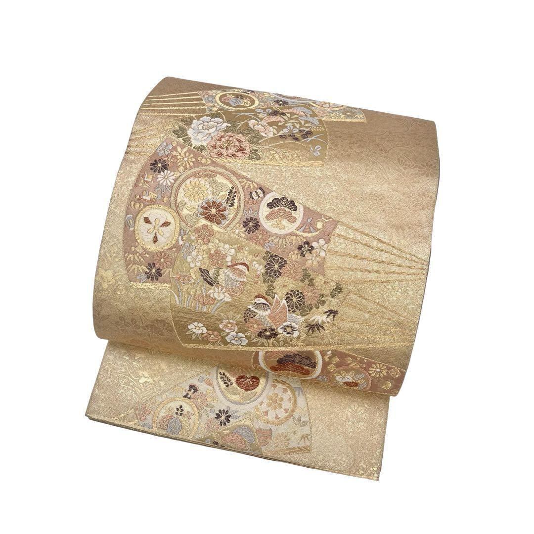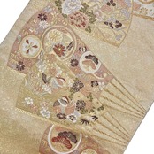 本金箔が使われた煌びやかな金色ベースのお色味、扇子に花柄模様、鴛鴦などの柄行がデザインされた素敵な柄行のお品でございます。
