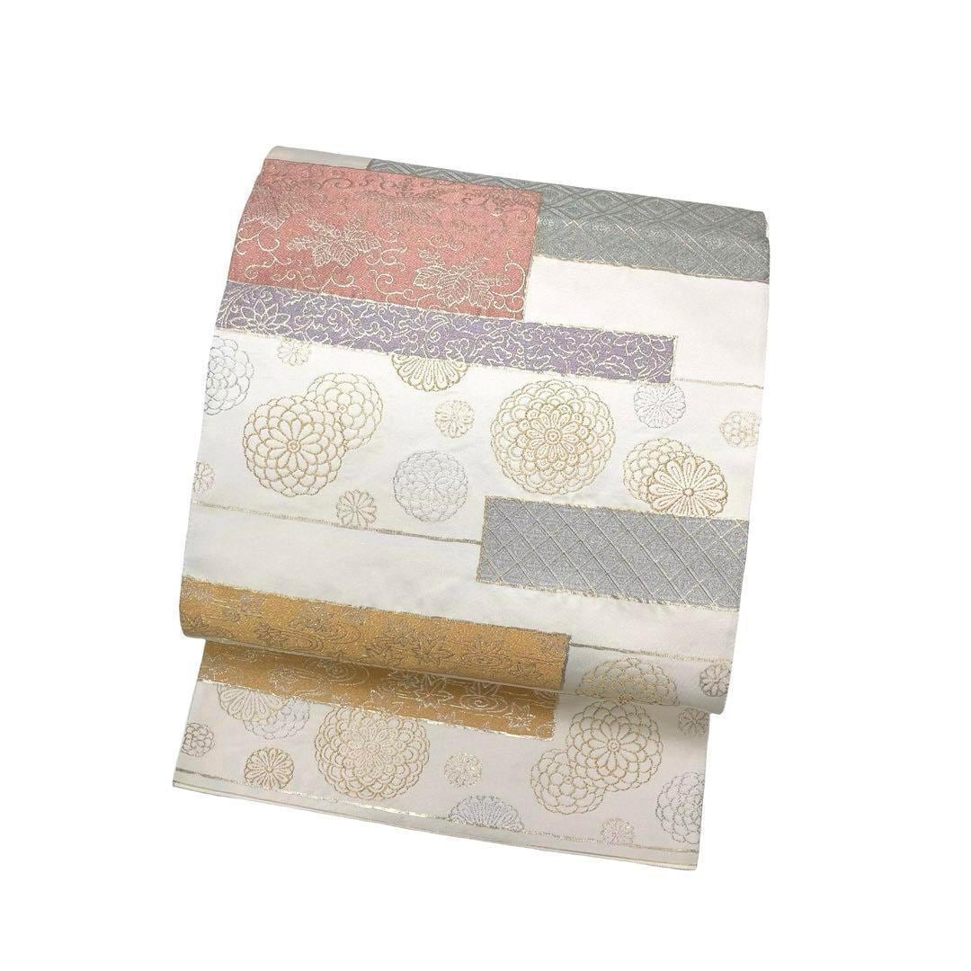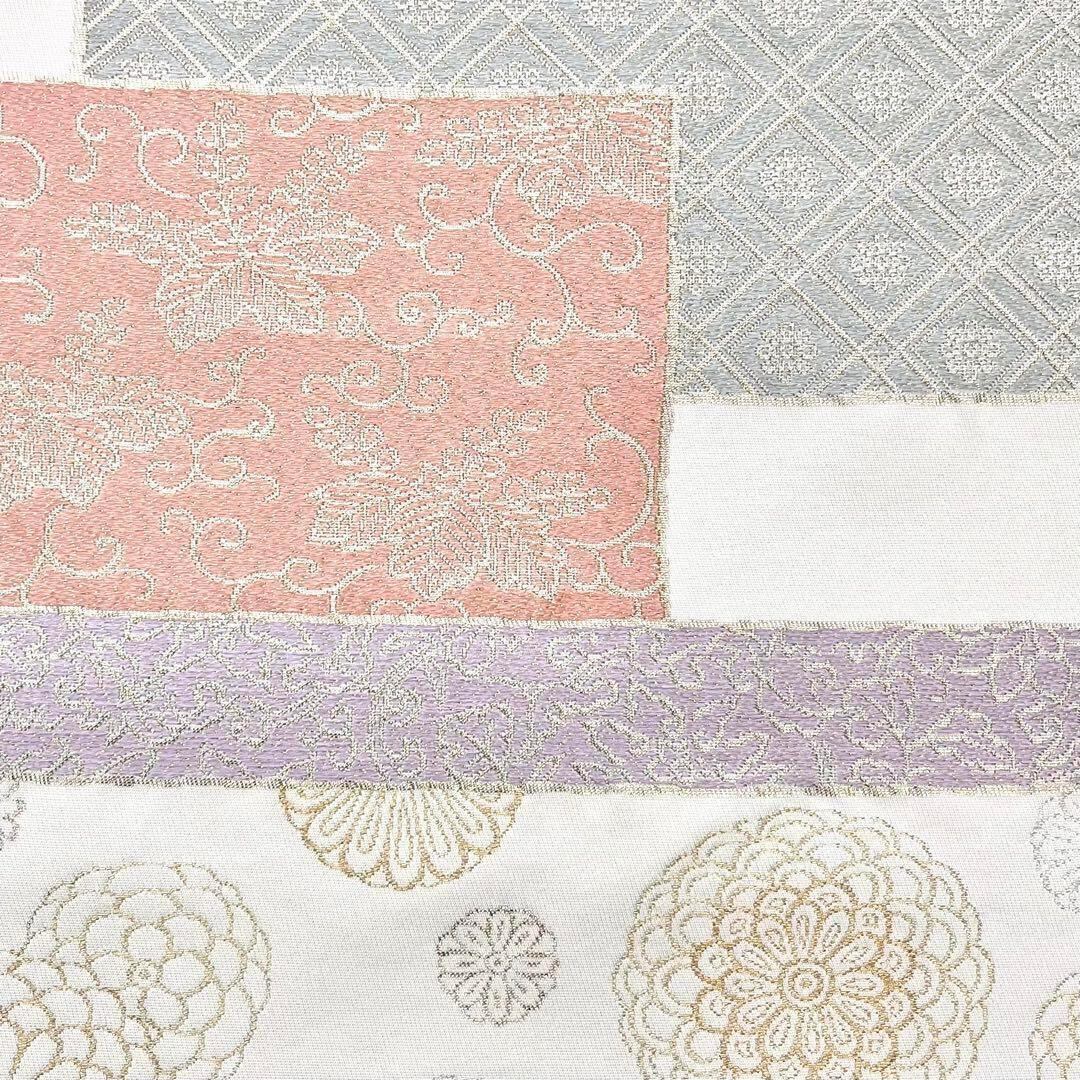 薄灰白色の上品なお色味に四角の中に花模様、花唐草など多様な紋様がデザインされた素敵な柄裄のお品でございます。