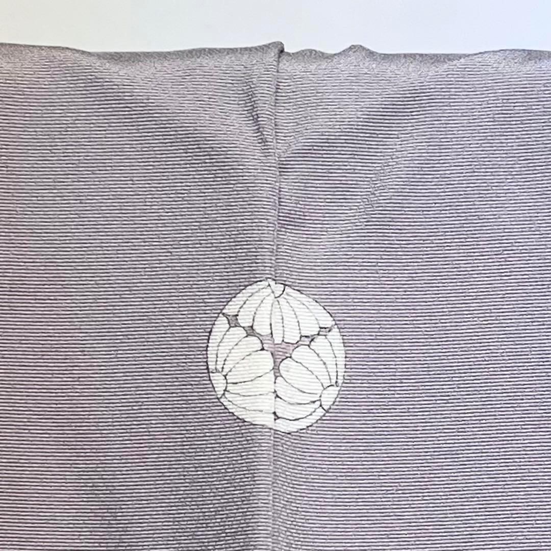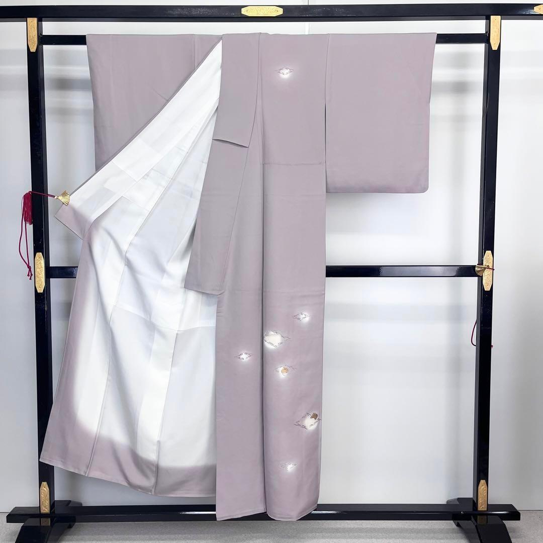 梅鼠色の品のあるお色味の縮緬に暈し、刺繍が使われた菱形に兎柄がデザインされた上品な柄裄のお品でございます。
