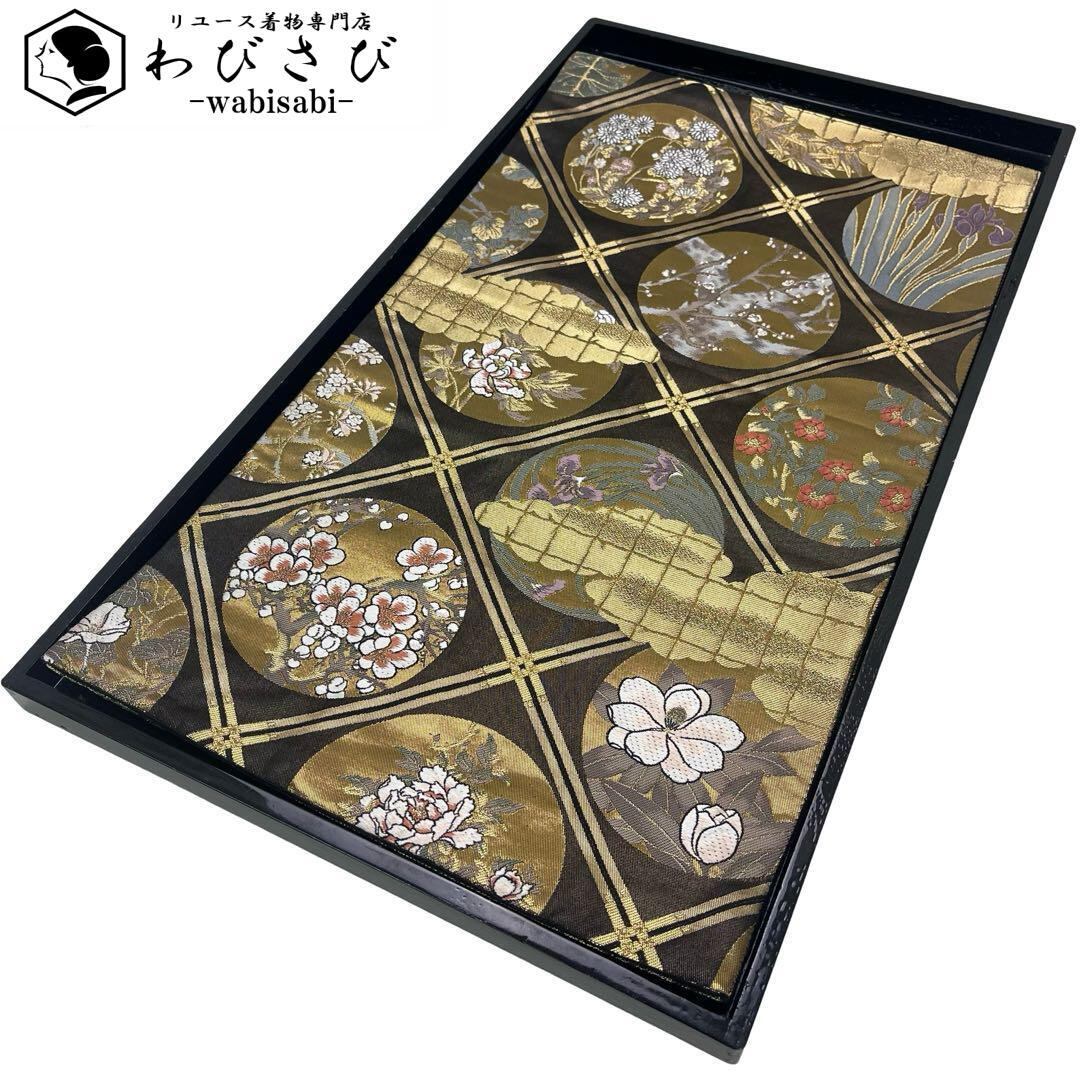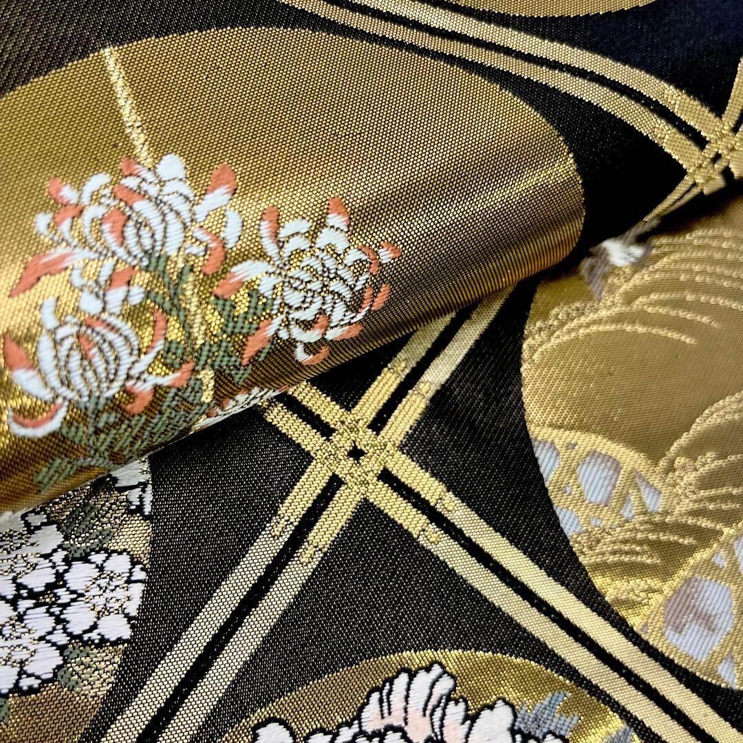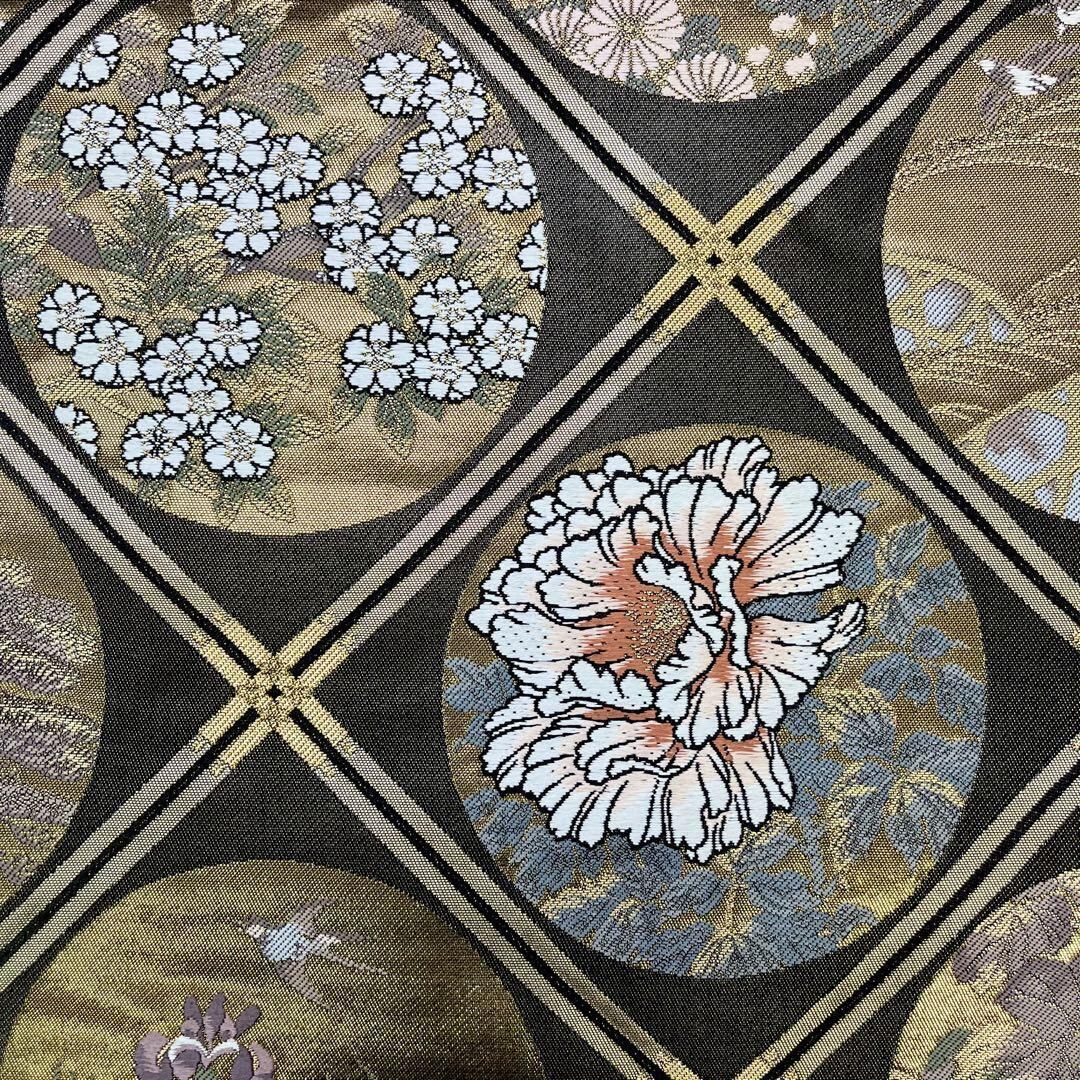 永平寺天井絵、本金箔二重箔織 、金色ベースの美しい色彩、斜め格子、丸の中に多様な花柄模様などがデザインされた美しい素敵な柄裄のお品でございます。