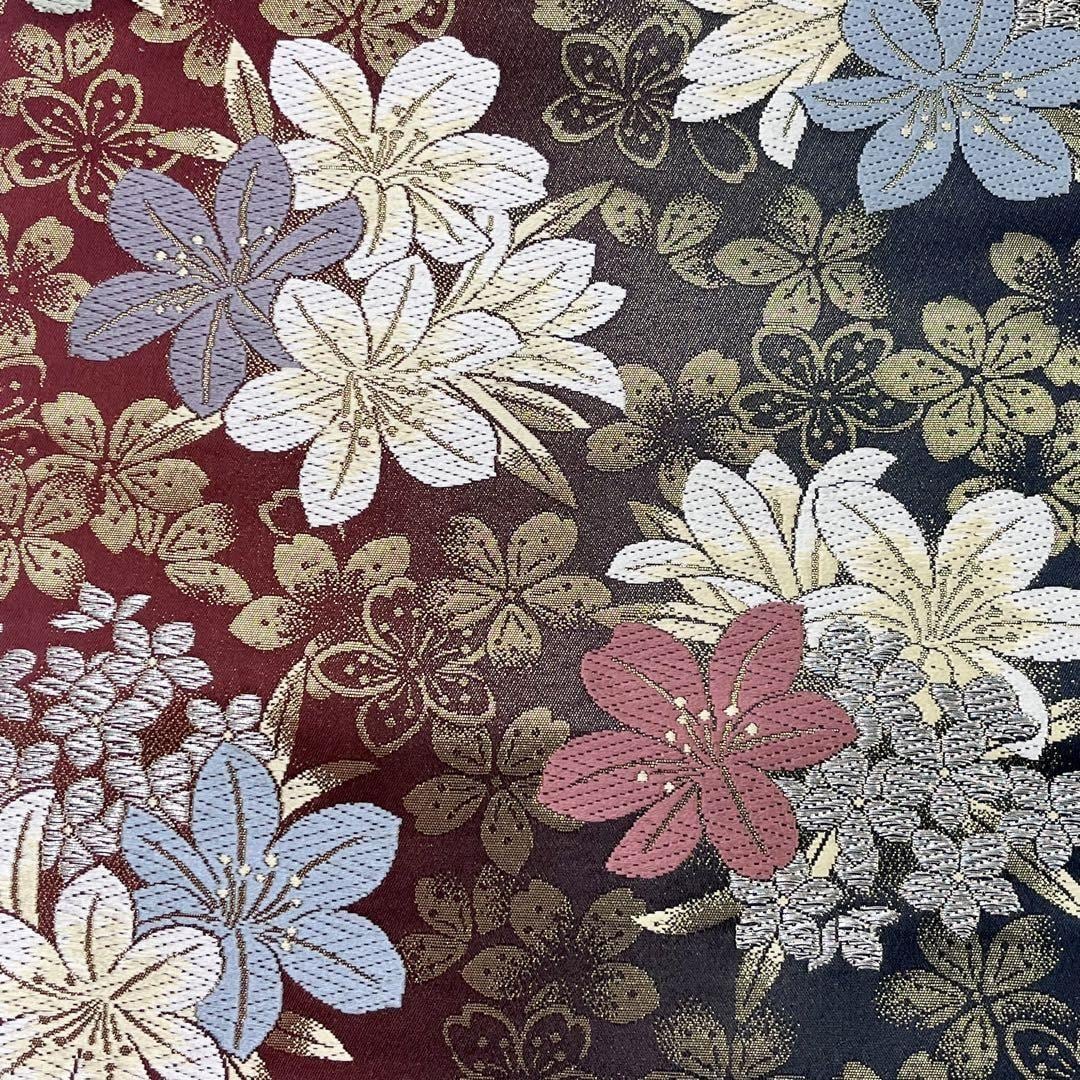 黒と赤味のグラデーション、百合の花模様、桜の花がデザインされた素敵な柄裄のお品でございます。