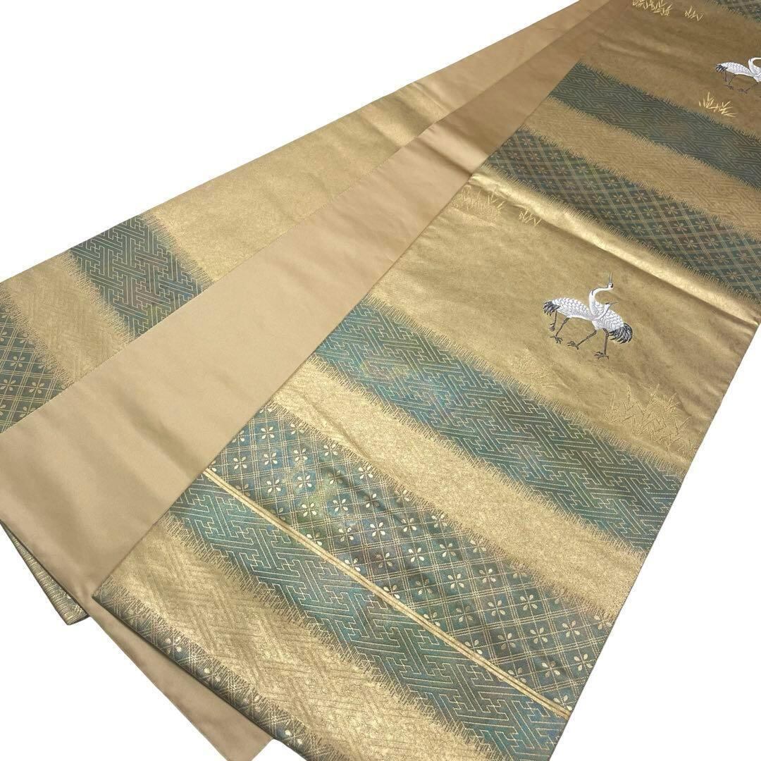 金色ベースの煌びやかなお色味に二羽の鶴柄、横柄の紗綾形、花菱模様がデザインされた品のあるお品でございます。
