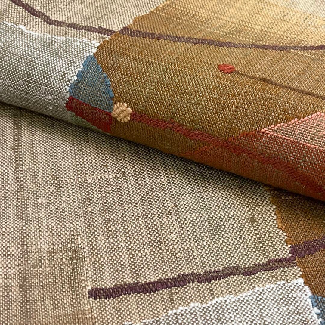 茅色の落ち着きのある紬地に抽象模様がデザインされた雰囲気の良い素敵な柄裄のお品でございます。