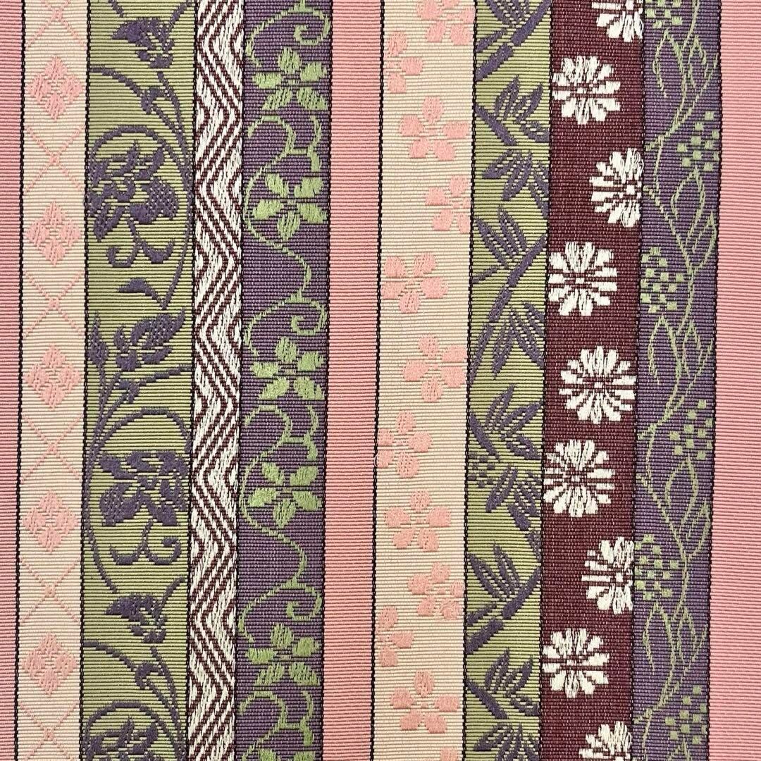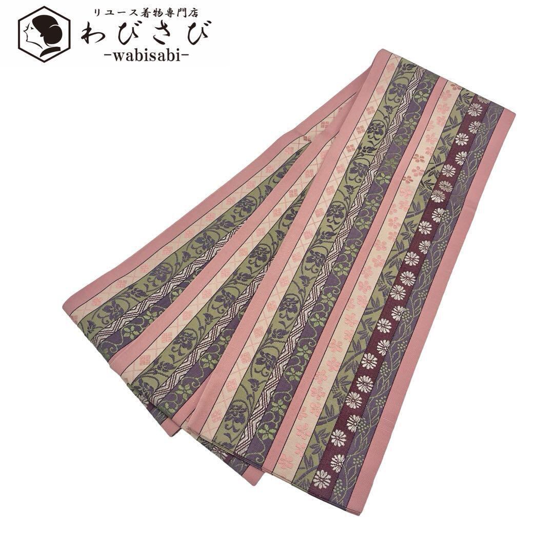 半幅帯 本場筑前博多織 縦縞模様に花唐草 竹 菱形 灰桃色 O-4193