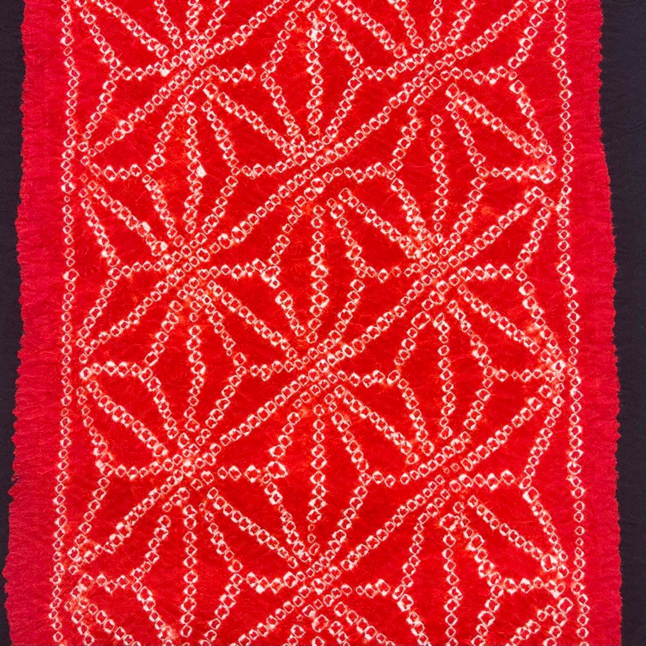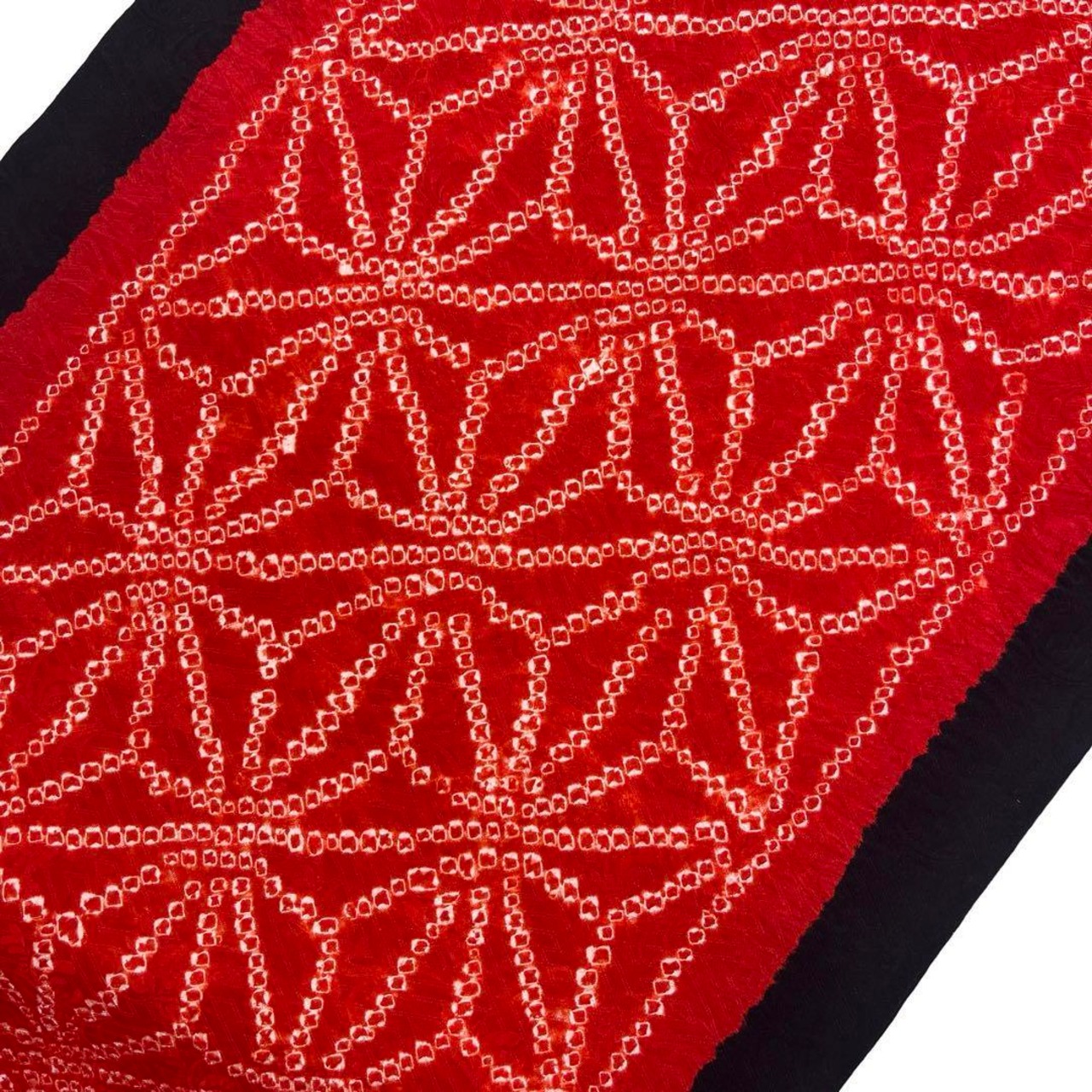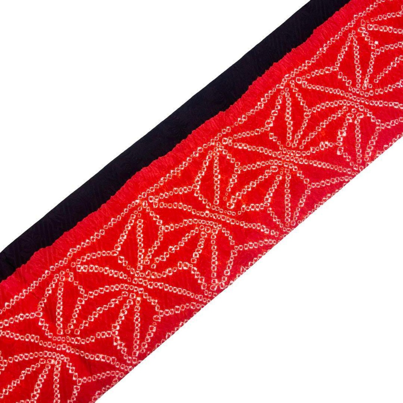 黒色に赤色の二色の色彩、絞り模様の麻の葉柄がデザインされた素敵な柄裄のお品でございます。