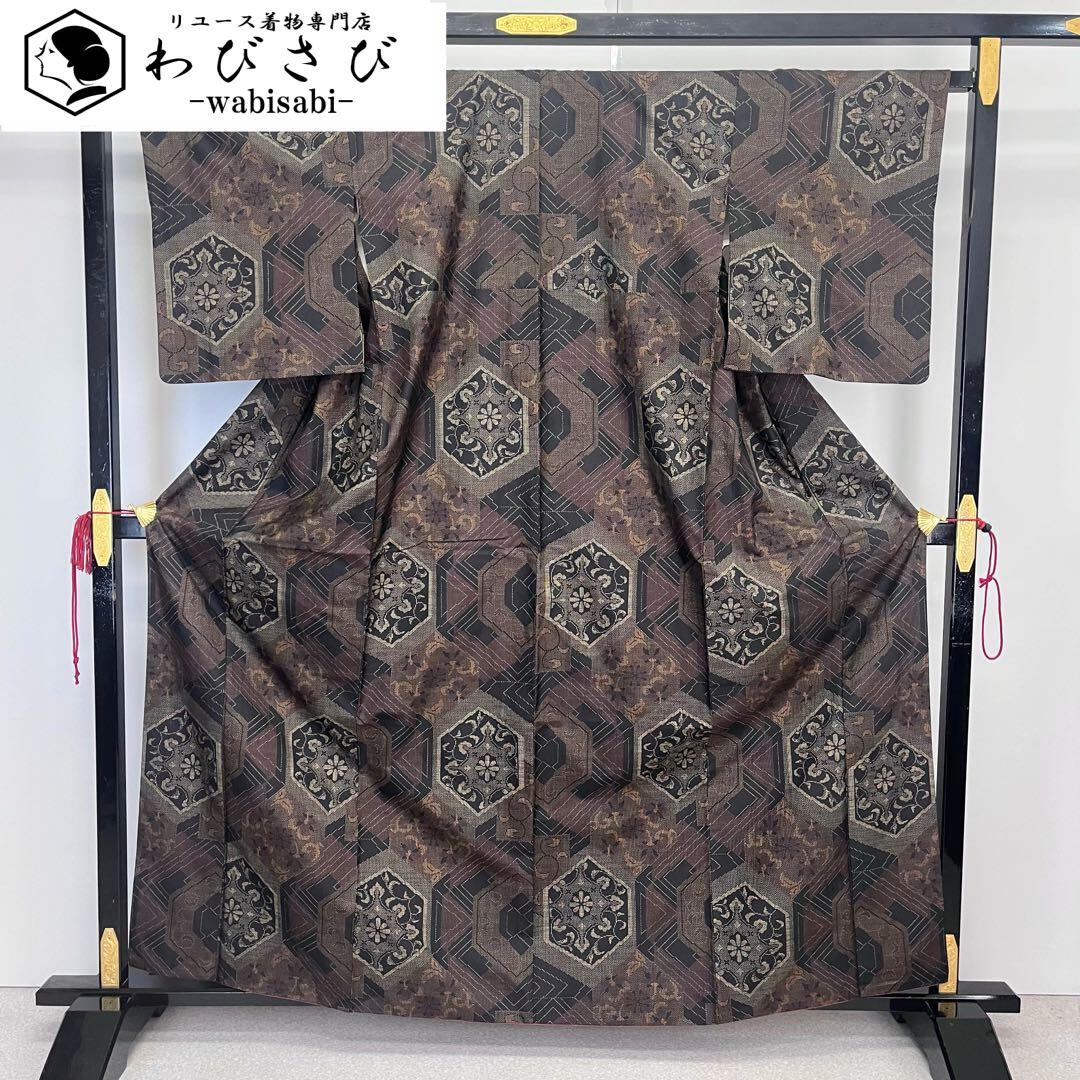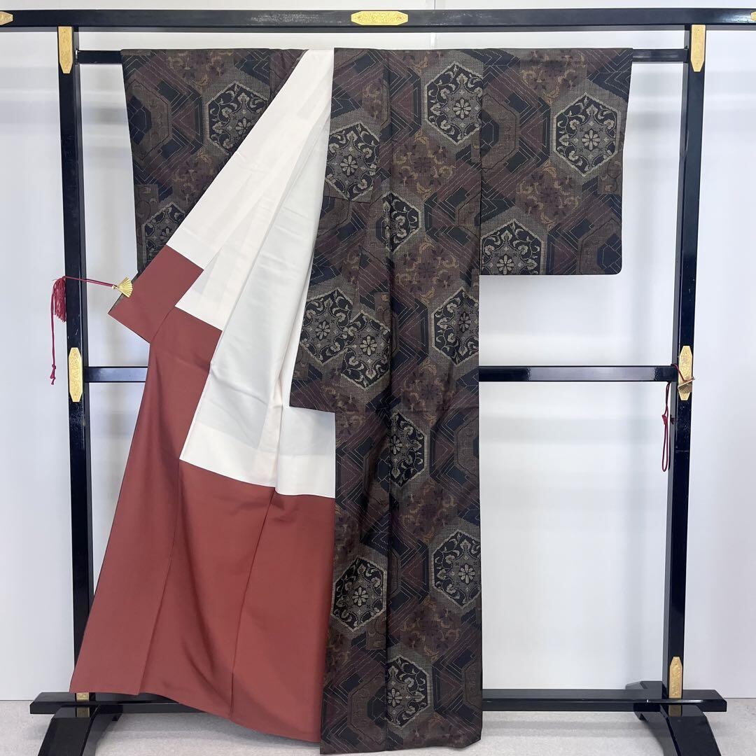 落ち着きのあるお色味、亀甲に華柄模様がデザインされた素敵な柄裄のお品でございます。