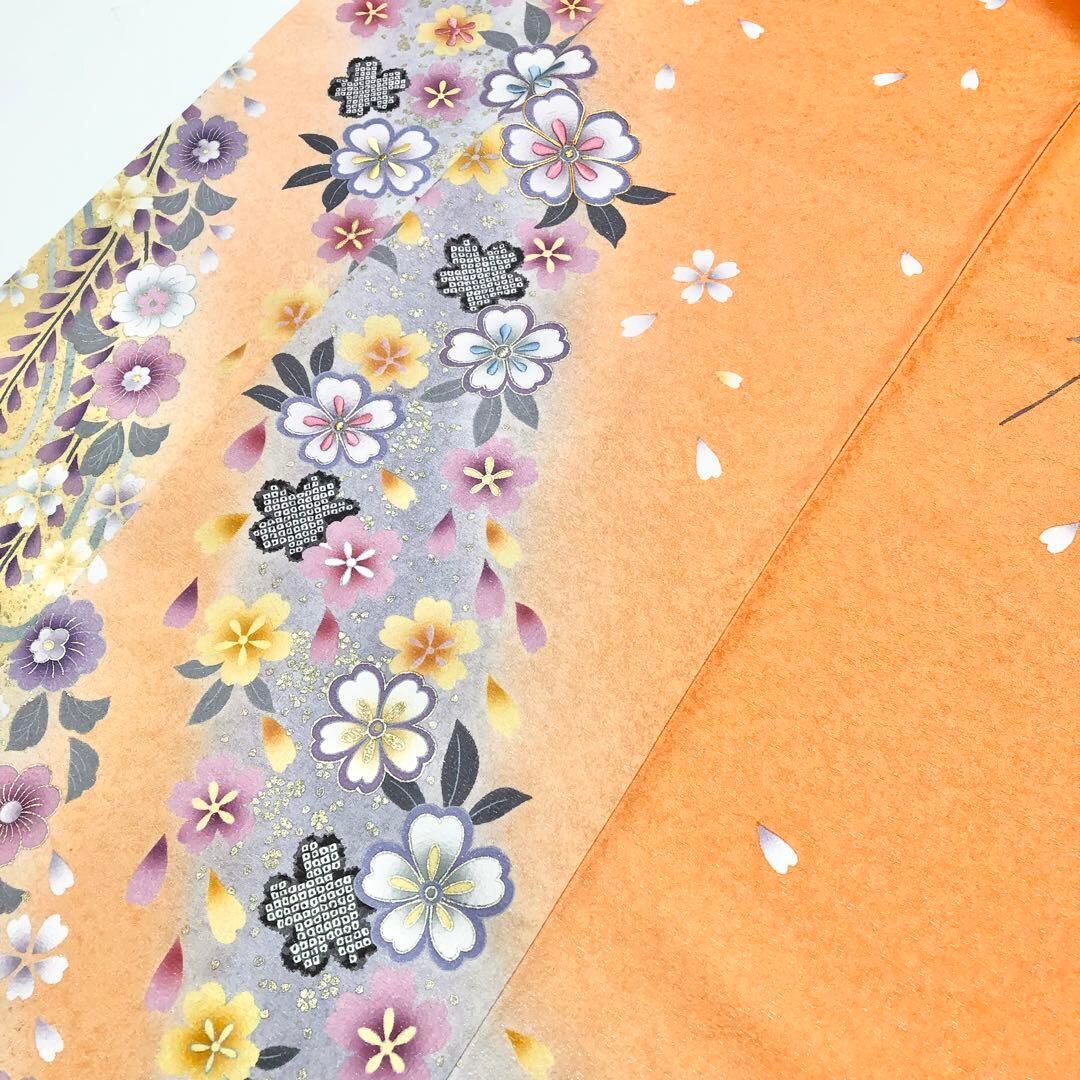 オレンジ色の鮮やかなお色にグラデーション、銀通し、美しい桜の花模様がデザインされた素敵な柄裄のお品でございます。