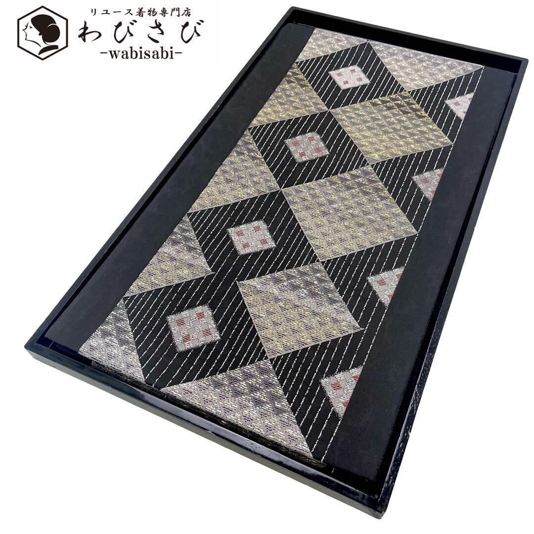 袋帯 モダンな菱形模様 縦縞 鱗 金銀糸 黒色 ガード加工 O-4219