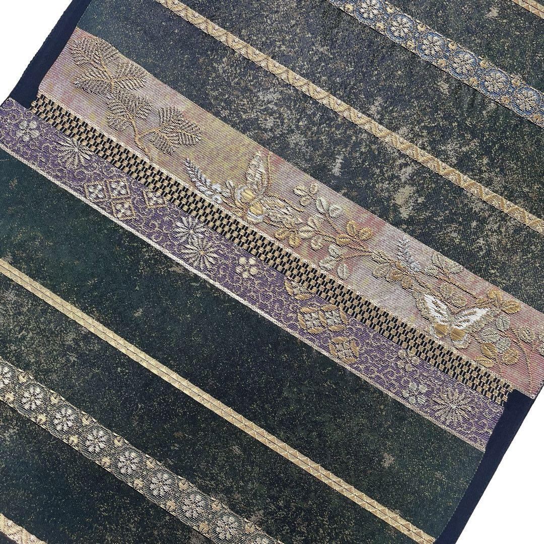 袋帯 横段花模様 蝶々 松に萩 金銀糸 黒緑色 O-4217 着物 きもの kimono 和服 和装 中古 リサイクル着物 【送料無料】
