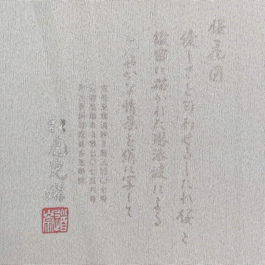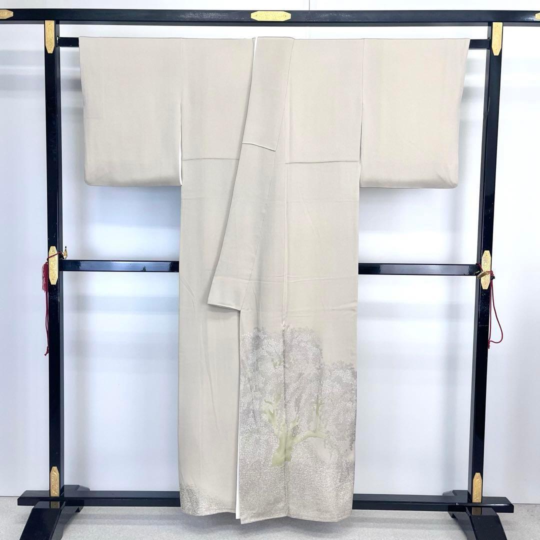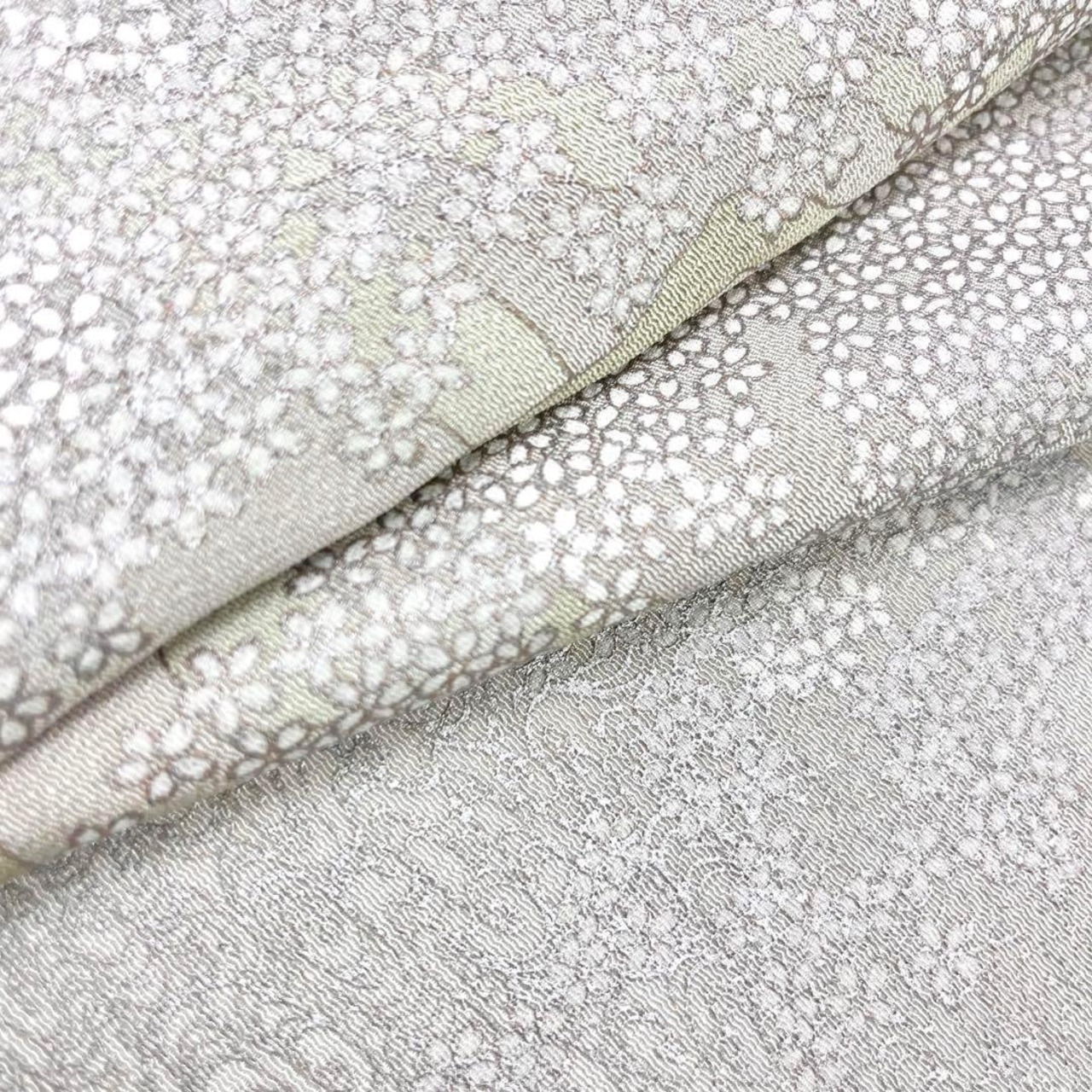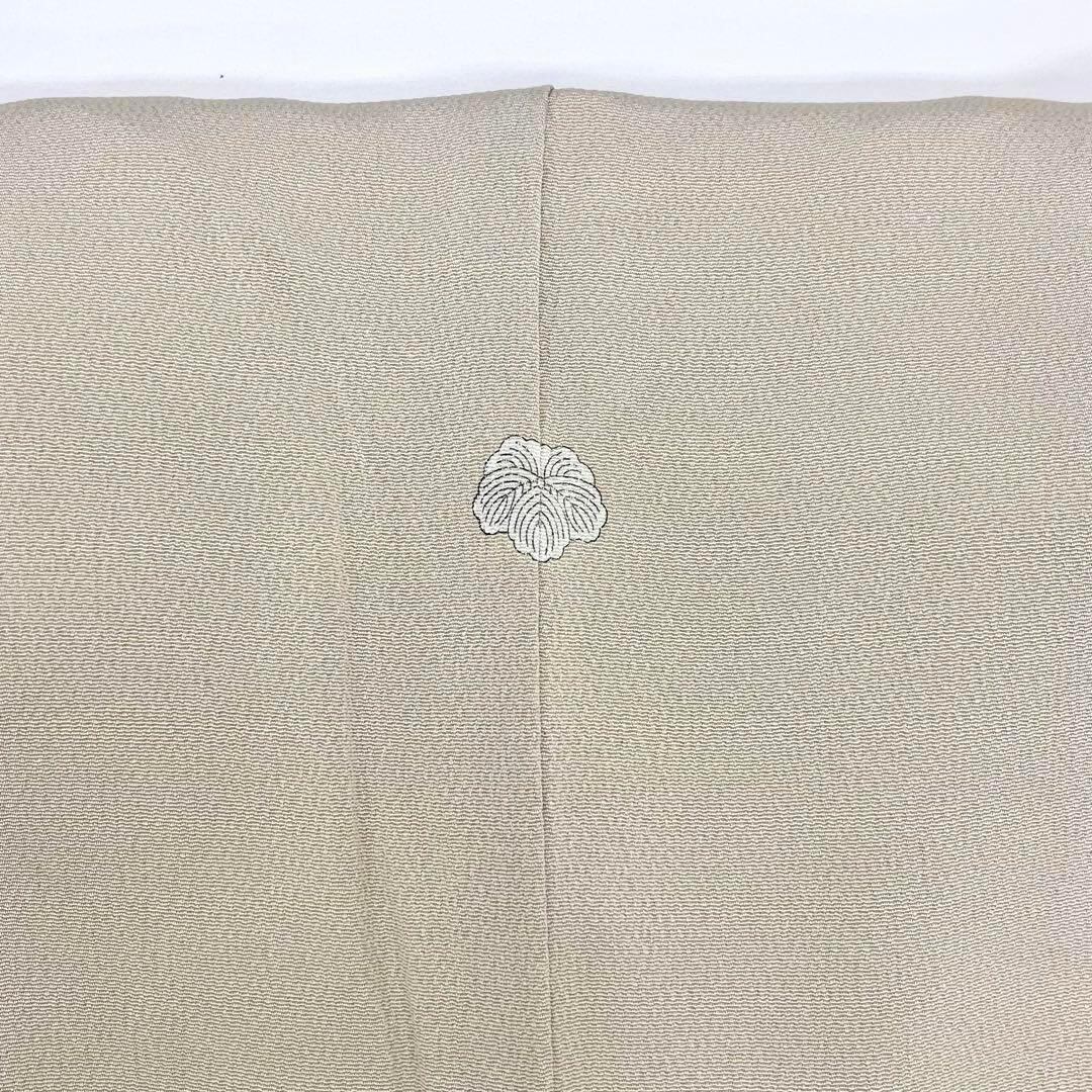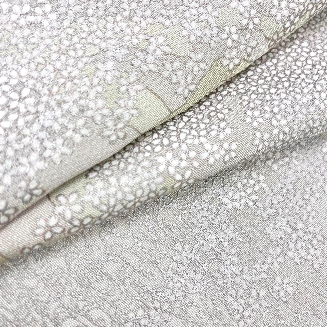 利休白茶色ベースの上品なお色味に桜花図と題された品のある色彩、柄裄がデザインされた素敵なお品でございます。